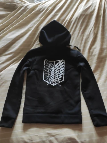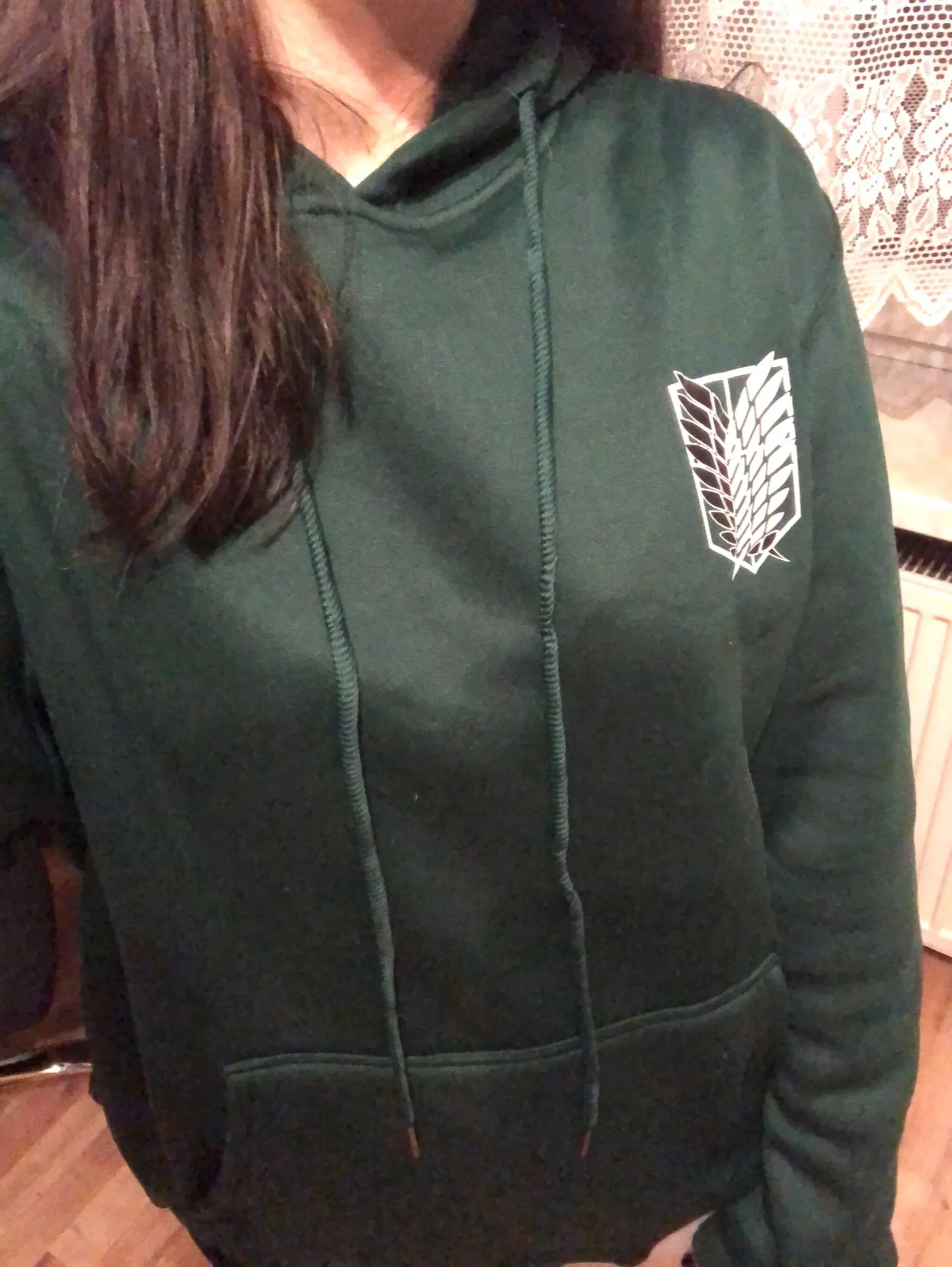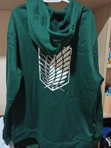 Толстовка с капюшоном из плотного и мягкого флиса, идеально подходит для осени. Зеленый очень красивый человек, и эмблема AOT идеальна. Если вам нравится свободная одежда, обязательно выбирайте на размер больше. (Я купил XL для своего брата)