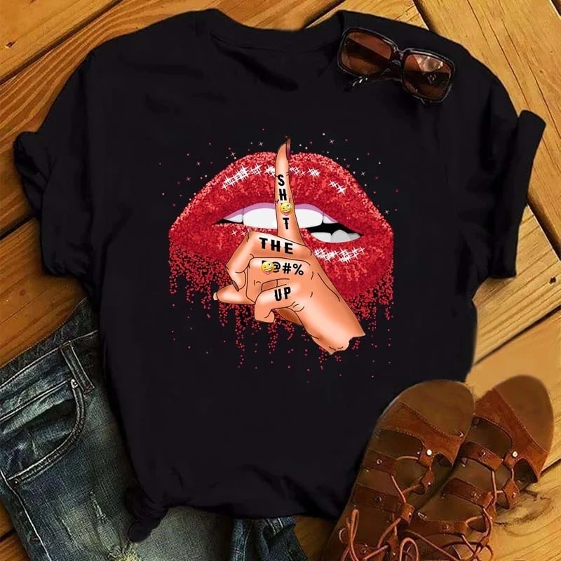 Футболка женская с коротким рукавом, модный, с изображением красных губ с принтом пальца, топ с мультяшным графическим принтом, на лето