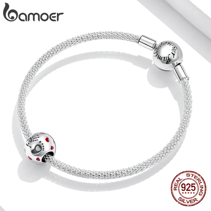 Браслет bamoer, серебряный, с сердечком, в форме сердца, с красной эмалью, 925 пробы, серебряный, Круглый, с бусинами, SCC1827