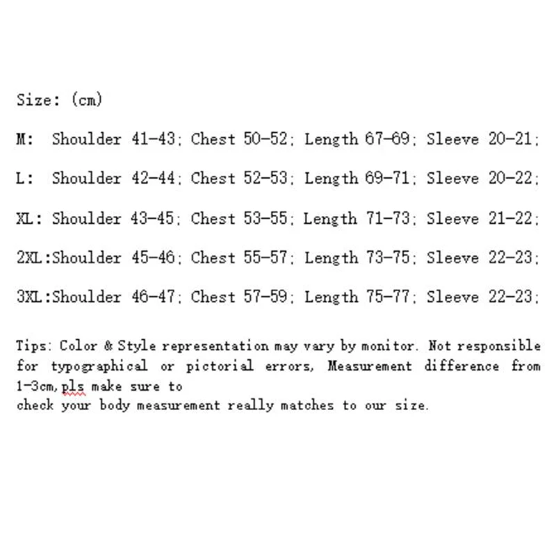 Размер: (см)М: Плечо 43-45; Грудь 49-50; Длина 64-66; Рукав 19-20;L: Плечо 45-46; Грудь 50-51; Длина 66-69; Рукав 20-21;XL: Плечо 46-47; Грудь 51-53; Длина 69-71; Рукав 21-22;2XL: Плечо 47-48; Грудь 53-55; Длина 71-72; Рукав 22-23;3XL: плечо 48-50; Грудь 55-57; Длина 72-74; Рукав 23-24;