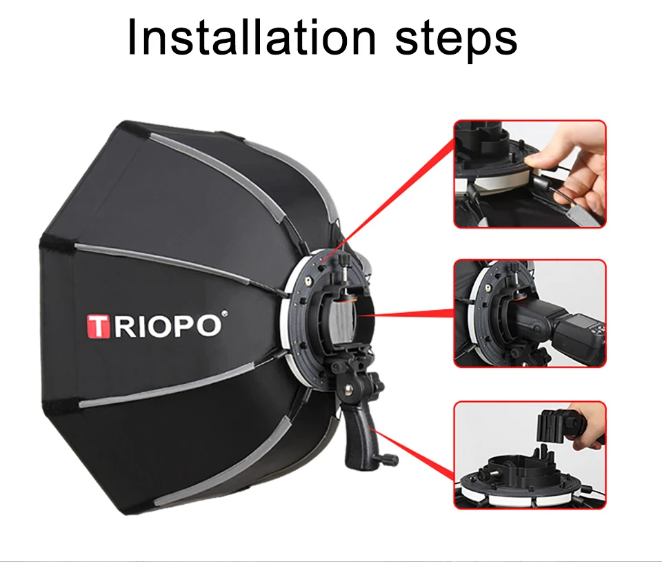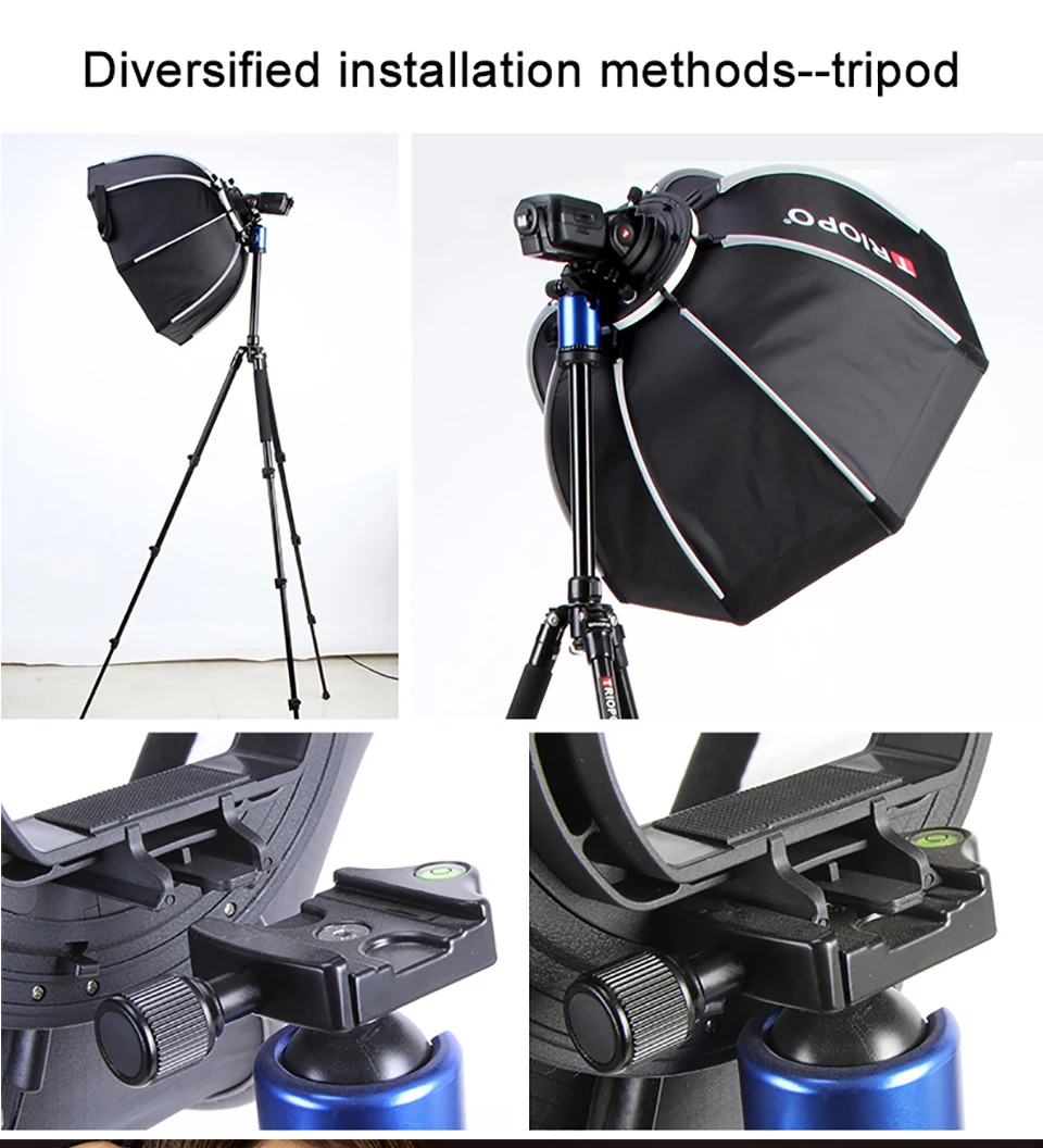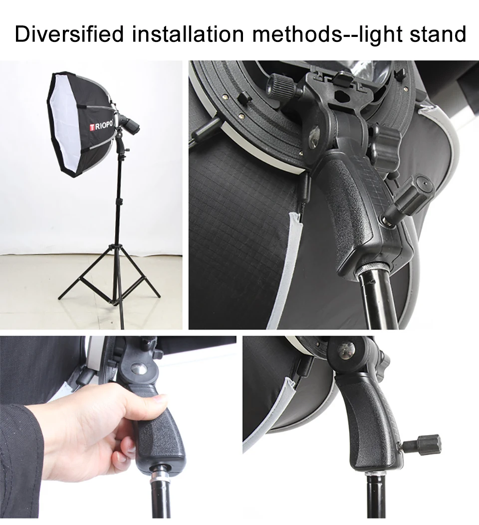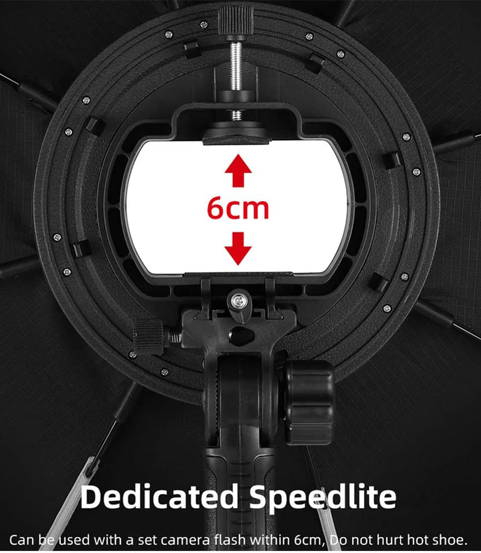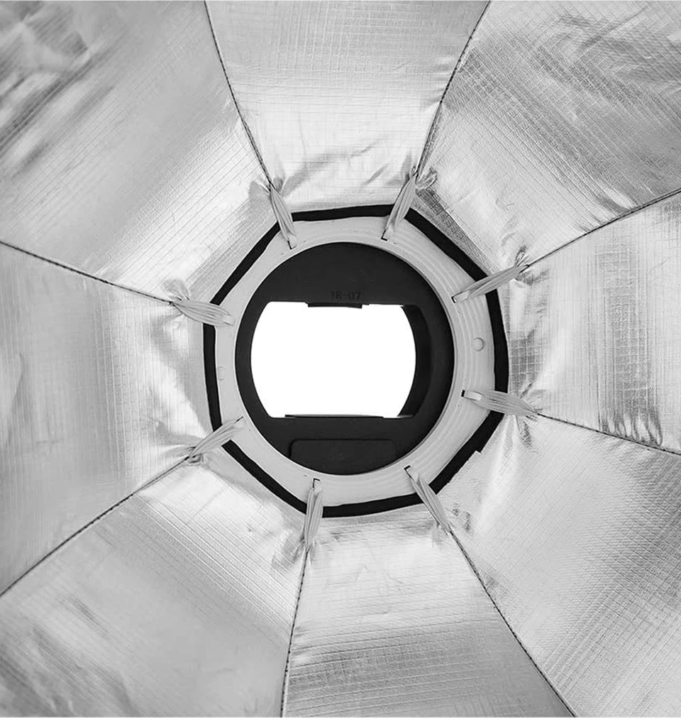 Особенности:1. Профессиональный, высококачественный 55 см/65 см/90 см складной восьмиугольный софтбокс.2. Легко собрать с 8 стержнями легко открыть и сложить для хранения, с портативной нейлоновой сумкой для переноски.3. Внутренний и внешний диффузор (съемный) для универсальности в переработке твердого/мягкого соотношения флэш-светильник, полностью металлические стержни, очень прочные и долговечные.4. С определенной степенью прочности, отвечающей требованиям дугообразной рамы для софтбокса.5. Отражающий серебряный внутренний светильник может минимизировать уменьшение, белая мягкая ткань равномерно смягчает светильник.6. Совместим с большинством вспышек камеры.7. Подходит для использования в портретной продукции для студийной съемки на открытом воздухе и т. д.