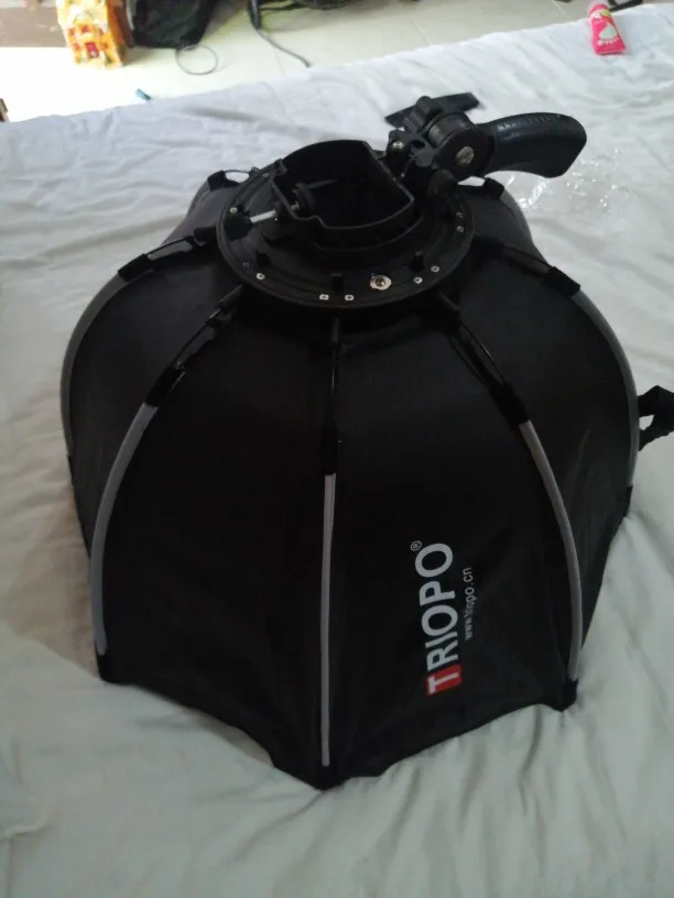 Нормальный октобокс, сшмто все ровно, собирается достаточно легко, кроме двух-трех последних спиц. Отсильного натяжения хрупкой девушке сложновато, приходится потрудиться. Я как раскрыла, так и оставила. Ощущение, что конструкция хлипковатая, но, сборные, наверное, все такие. Зато очень компактный с сложенном виде. Есть опасения о прочности держателя. Всё детали - пластик. Сколько держатель прослужит - думаю, не долго. Причём смм октобокс с зафиксированной вспышкой держится на пластиковой пипке. Сомнительное инженерное решение, конечно. И место крепления к стойке - пластик. Сейчас бы лучше взяла октобокс с креплением bowens, и закрепила бы его на нормальным godox - ий держатель для вспышки (он у меня есть, там основные места крепления из металла, те есть с чем сравнить). В общем - нормально, но могло быть и лучше.