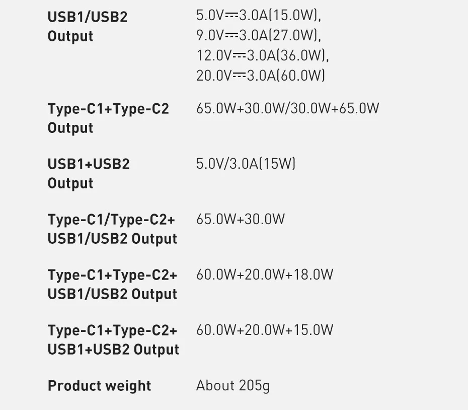 Вход:Переменный ток 100 в-240 в, 50/60 Гц, макс. 240 АВыход:Тип C 1 Выход: 5 В/3A, 9 В/3A, 12 В/3A, 15 в/3A, 20 в/5AТип C 2 Выход: 5 В/3A, 9 В/3A, 12 В/3A, 15 в/3A, 20 в/5AUSB 1 Выход: 5 В/3A, 9 В/3A, 12 В/3A, 20 в/3AUSB 2 выхода: 5 В/3A, 9 В/3A, 12 В/3A, 20 в/3AОдновременная зарядкаТип C 1 + Тип C 2 Выход: 65 Вт + 30 ВтUSB 1 + USB 2 Выход: 5 В/3 А 15 ВтТип C 1 + USB 1 выход: 65 Вт + 30 ВтТип C 1 + выход USB 2: 65 Вт + 30 ВтТип C 2 + USB 1 выход: 65 Вт + 30 ВтТип C 2 + выход USB 2: 65 Вт + 30 ВтТип C 1 + Тип C 2 + USB 1 выход: 60 Вт + 20 Вт + 18 ВтТип C 1 + Тип C 2 + USB 2 Выход: 60 Вт + 20 Вт + 18 Вт