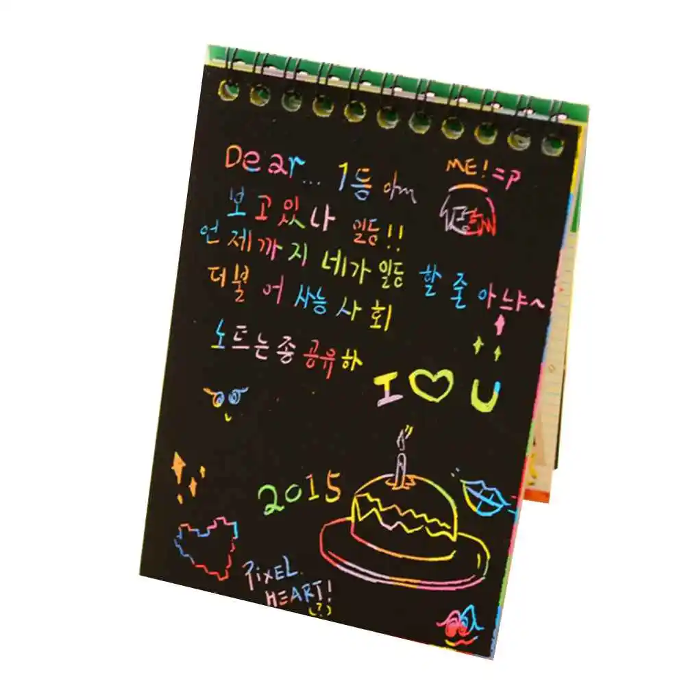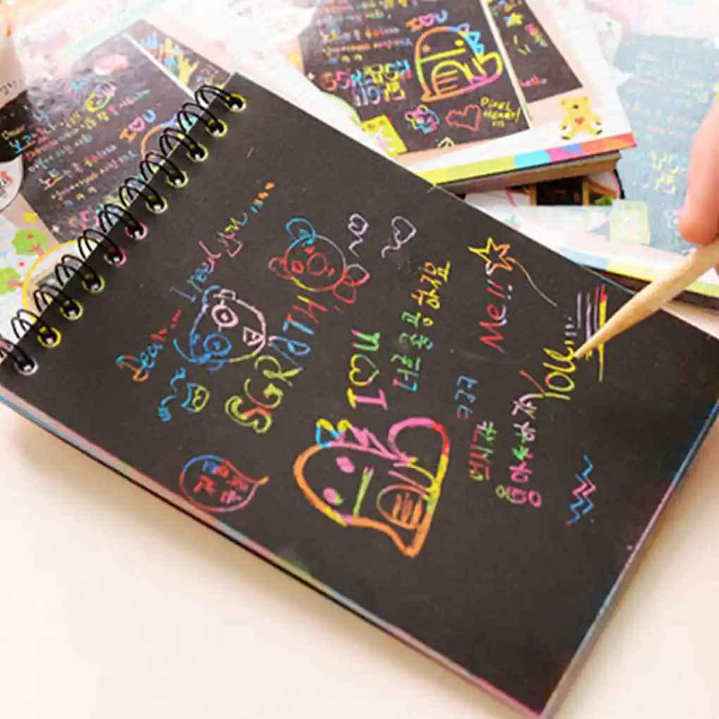 Просто поцарапайте черное покрытие прилагаемым деревянным стилусом, чтобы раскрыть калейдоскоп цветов под ним.