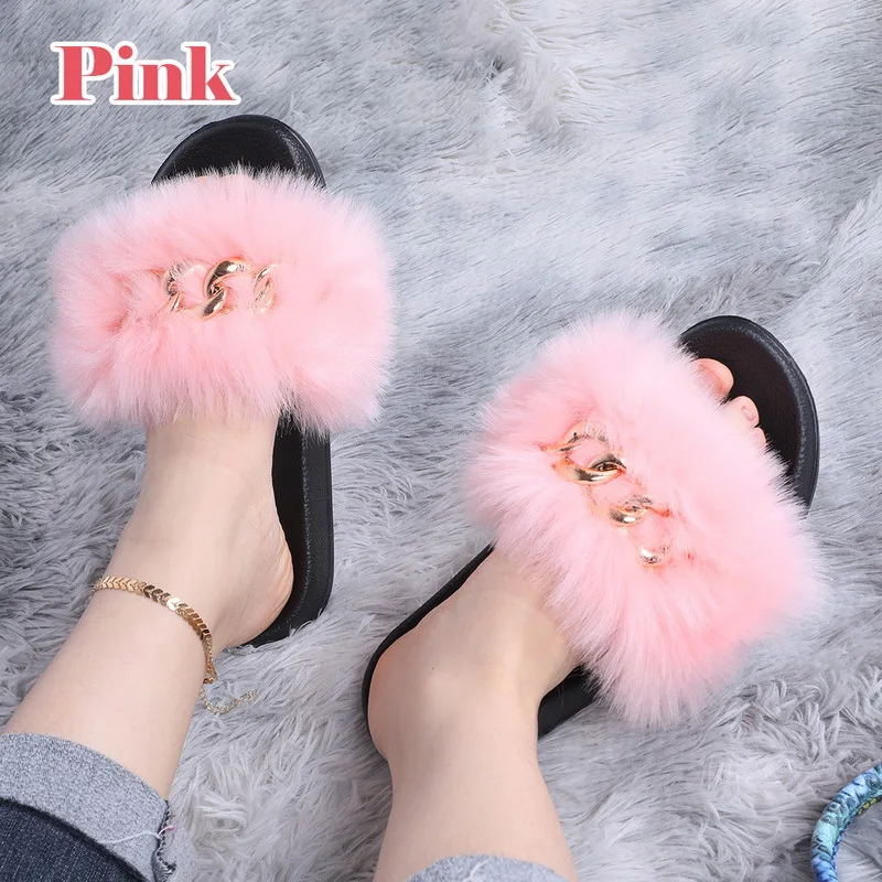 Шлепанцы женские с золотистой цепочкой, плюшевые шлепанцы, мех лисы...