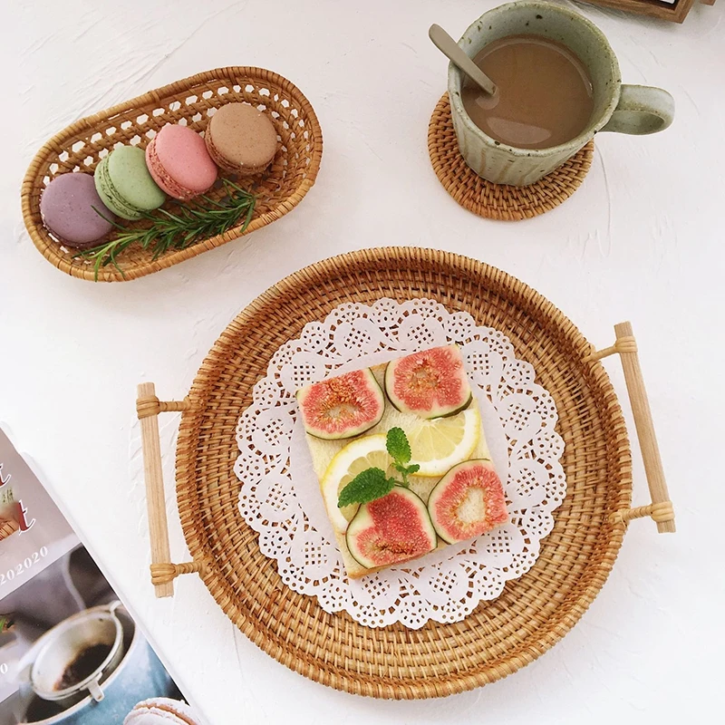 Ротанг ручной работы круглый высокий настенный отрубной лоток для хранения еды тарелка над ручками для завтрака закуски для кофе чая