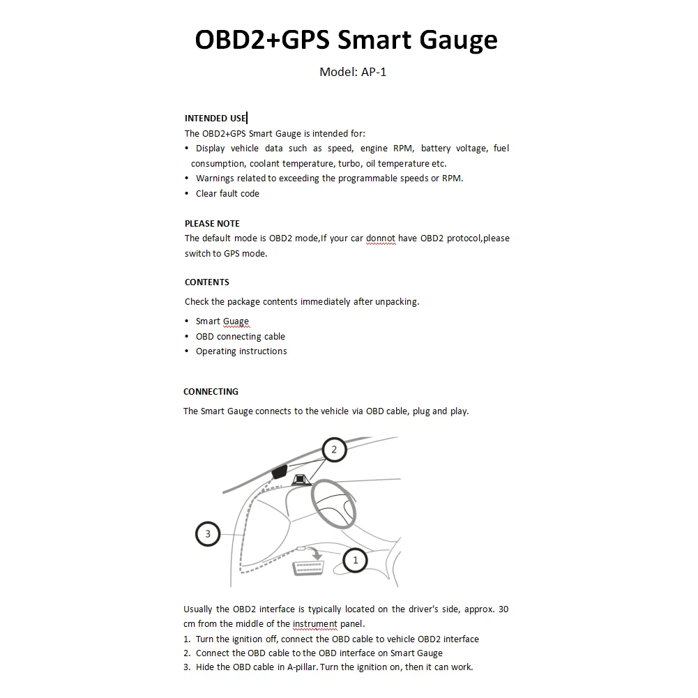 Особенности:1. Двойная система OBD + GPS.2. Два способа установки: Установка стойки + установка центральной консоли. Первый секундомер, который можно установить на А-столб.3. В настоящее время первый экран может поворачиваться на 270 градусов.4. Первая Небольшая Таблица кодов HUD достигает максимального разрешения 240*240 для дисплея высокой четкости.5. Существует три типа давления турбины: PSI, 100 кПа, бар. Значение турбины можно отрегулировать и откалибровать для увеличения единицы расхода топлива км/л.6. Частота обновления до 10 Гц, задержки не будет.7. Функция GPS может отображаться одновременно в режиме OBD, который в настоящее время является первым в отрасли. Когда скорость переключается на миль/ч на милю, температура воды будет автоматически переключаться на градусы Фаренгейта, одиночное расстояние движения также будет автоматически переключено на мили, И расход топлива также будет автоматически переключаться на галлоны MPG.8. Можно переключать 8 видов экранов.9. Функция: Режим OBD2: скорость, обороты в минуту, температура воды, напряжение, расход топлива, часы, расстояние одного хода, время одного хода, температура масла, давление турбины, тест на ускорение, испытание тормозов, оповещение о превышении скорости, оповещение о сбое двигателя, устранение кода неисправности, оповещение о температуре воды, оповещение о скорости, Сигнализация напряжения, мильный переключатель, напоминание об утомляемости, автоматическая и ручная регулировка яркости.10. Режим GPS: скорость в час, высота, количество спутников, часы, пробег за одну поездку, время за одну поездку, компас.Спецификация:Материал: ABSЦвет: черныйСистема: OBD + GPSРазмер экрана: 2 дюйма LCDРазрешение экрана: 240*240Размер чистого металла: около 9,7*6,1*4,9 см/3,82*2,40*1,93 дюймаВес Чистого металла: около 40 гДлина линии: 175 смПрименение: все моделиКомплектация:1 хост1 кабель OBD21 x крючок и петля1 x Руководство пользователя на английском языкеПримечание: следующие годы и типы автомобилей не совместимы1. Автомобили до 04 в Европе и Америке нельзя использовать2. Азиатские автомобили до 2008 нельзя использовать
