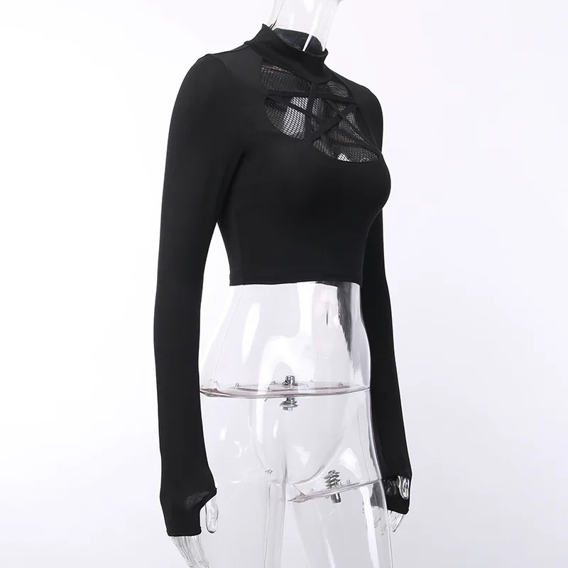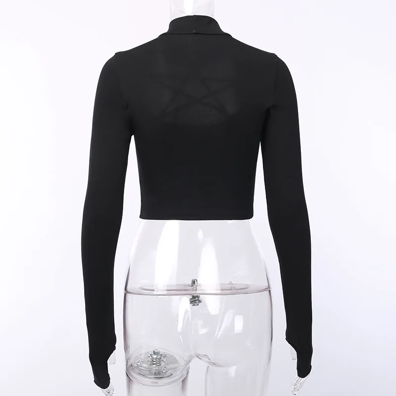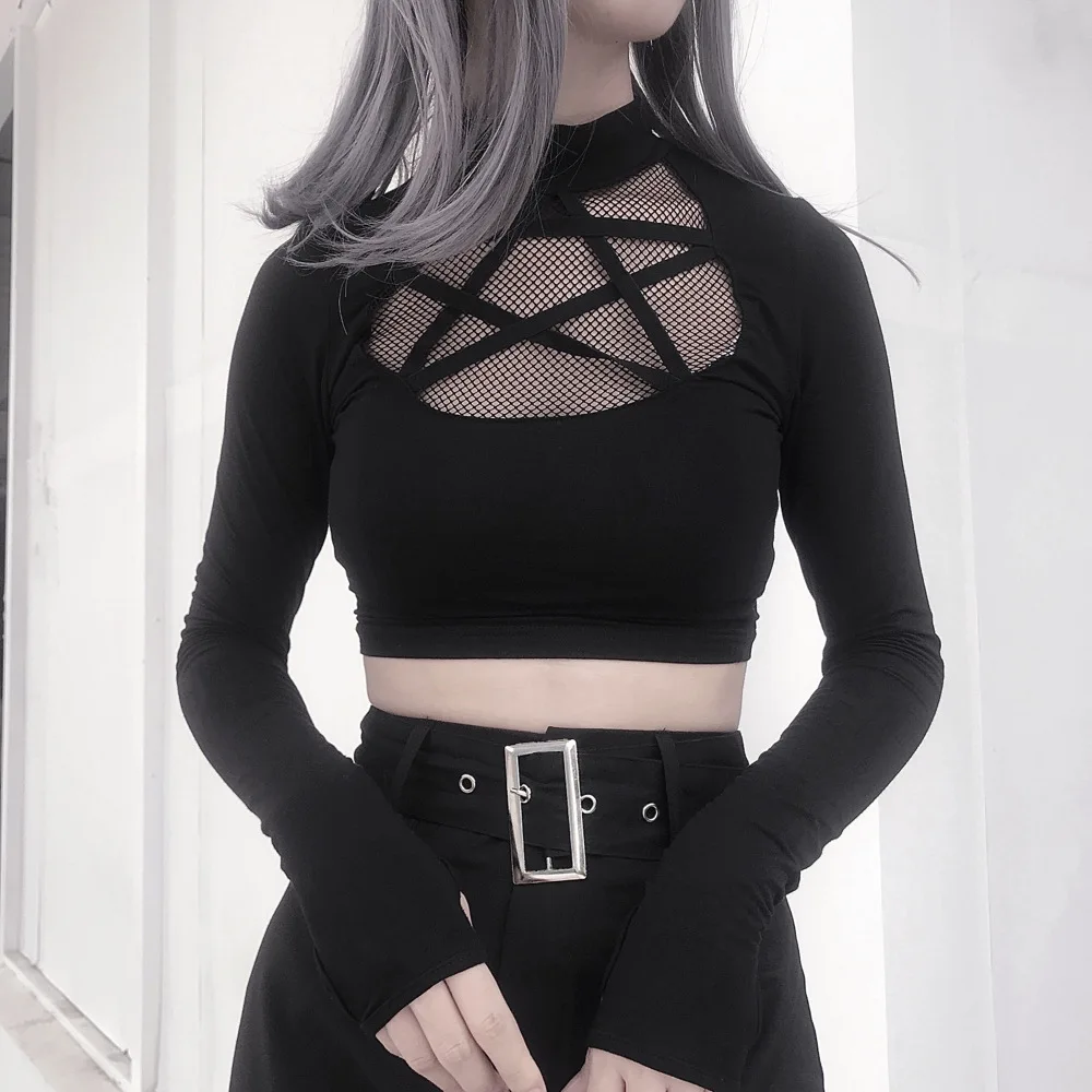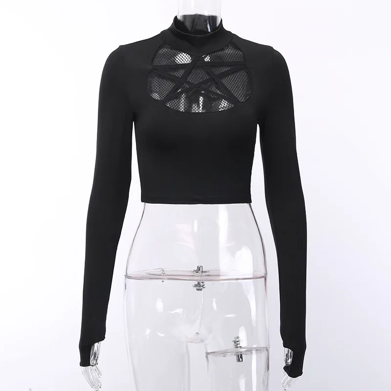 Женский укороченный Топ с длинным рукавом, черный облегающий топ в готическом стиле с вырезами и пентаграммой, уличная мода на осень