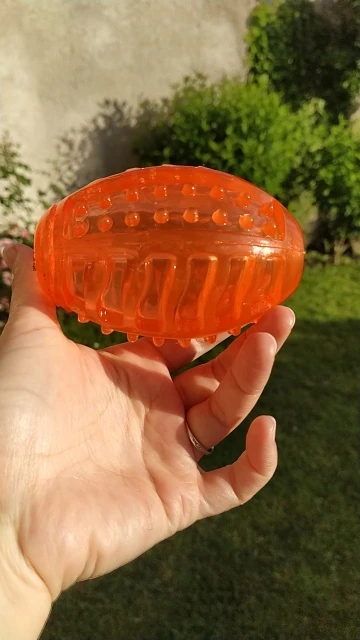 очень долгая доставка почти два месяца, но мячик крутой, лёгкий, думал что Джек Рассел разгрызает в первый день, или куски будет откусывать от него но на удивление Мяч уже третью неделю держится