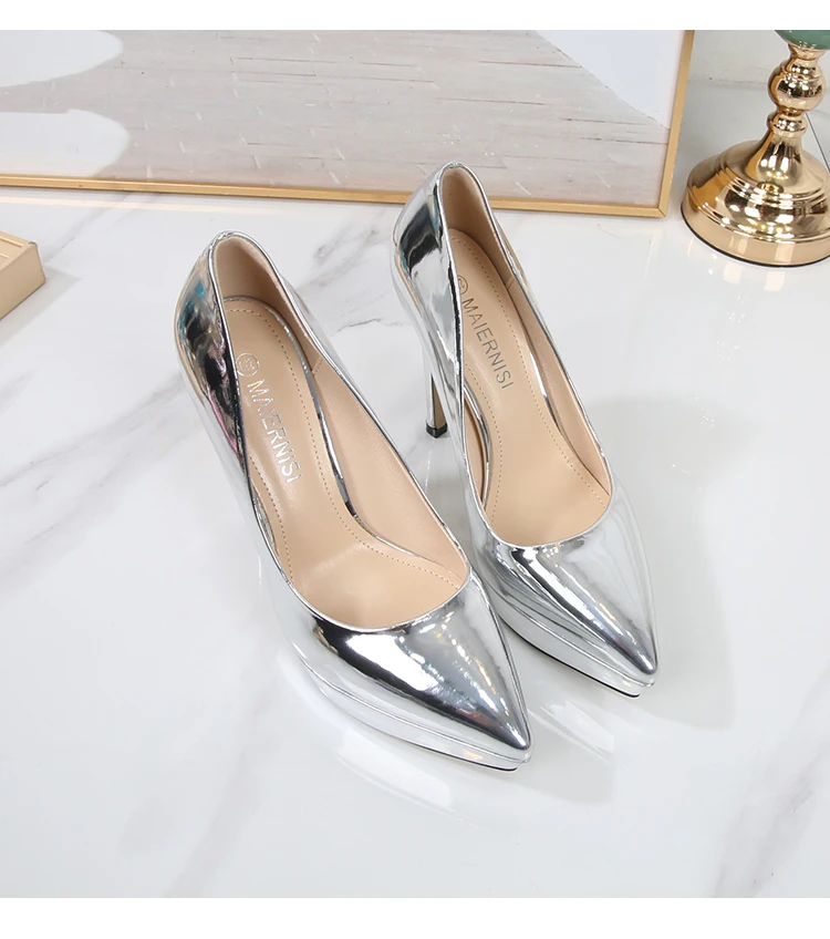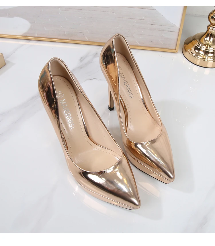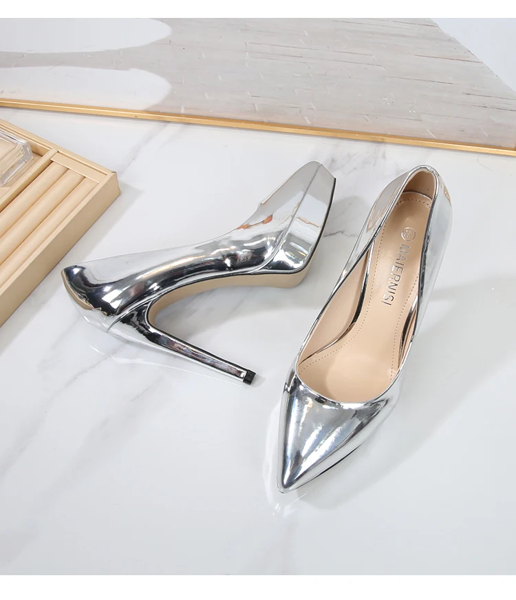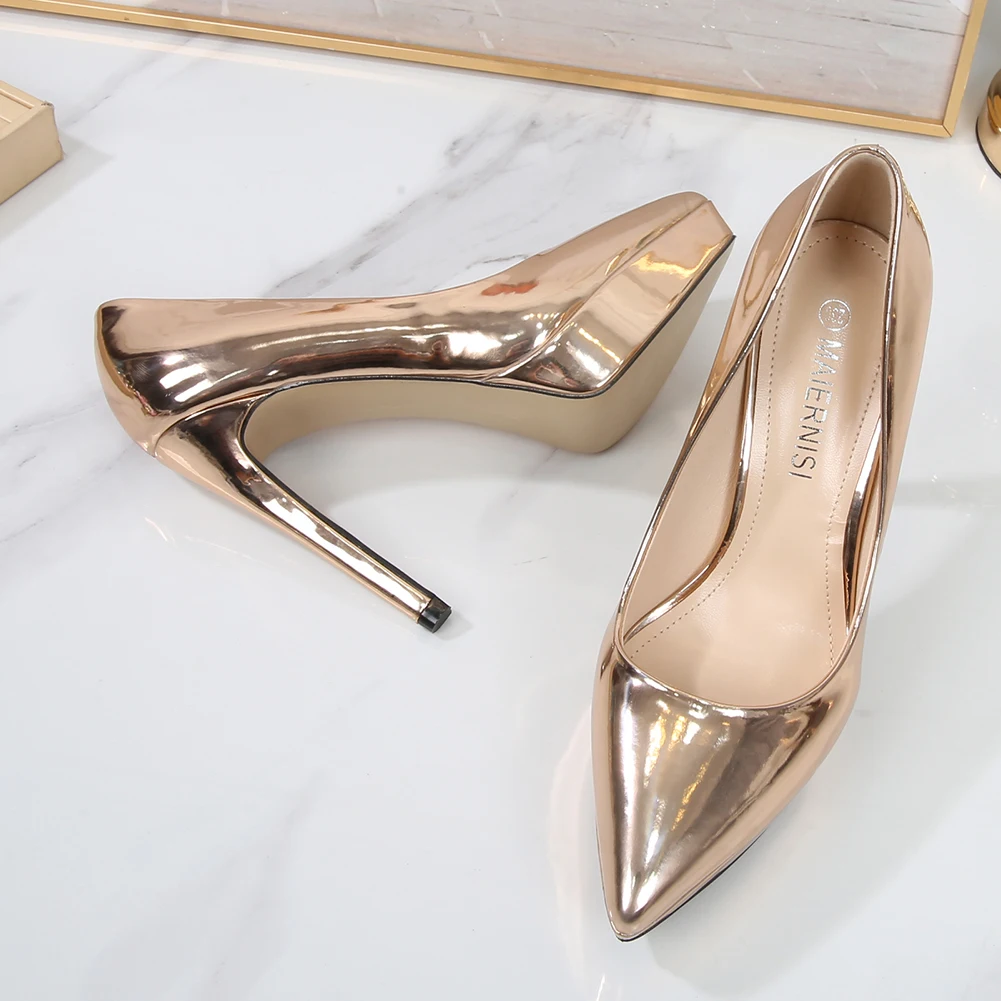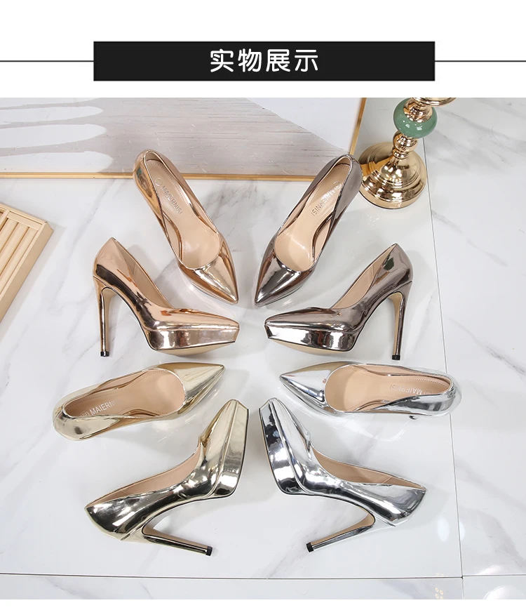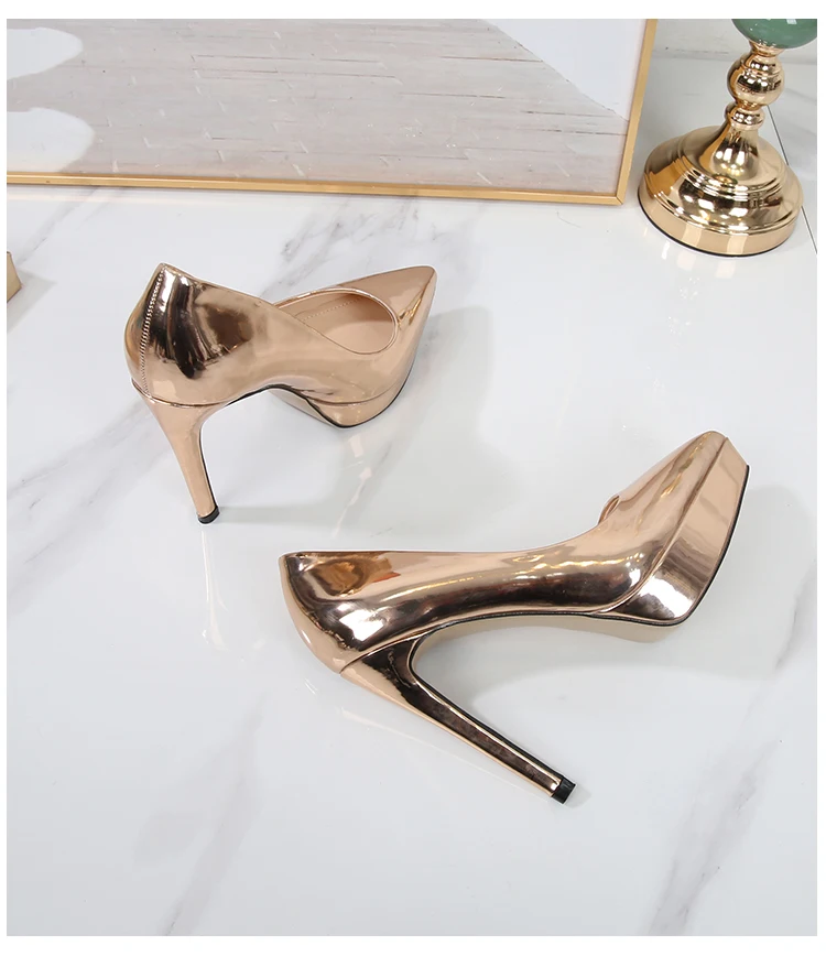 Туфли на высоком каблуке 12 см, женские блестящие туфли из лакированной кожи, металлические, серебристые, золотистые свадебные туфли, пикантные туфли на платформе с острым носком