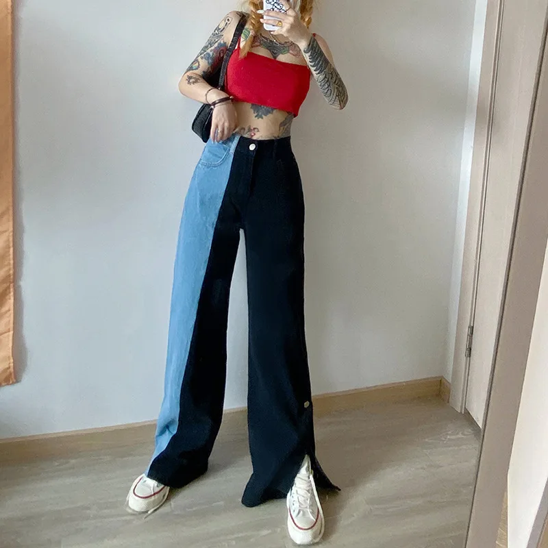 Брюки женские джинсовые с широкими штанинами, модные повседневные свободные брюки в стиле пэчворк, с боковым покрытием, на пуговицах, с разрезом, уличная одежда