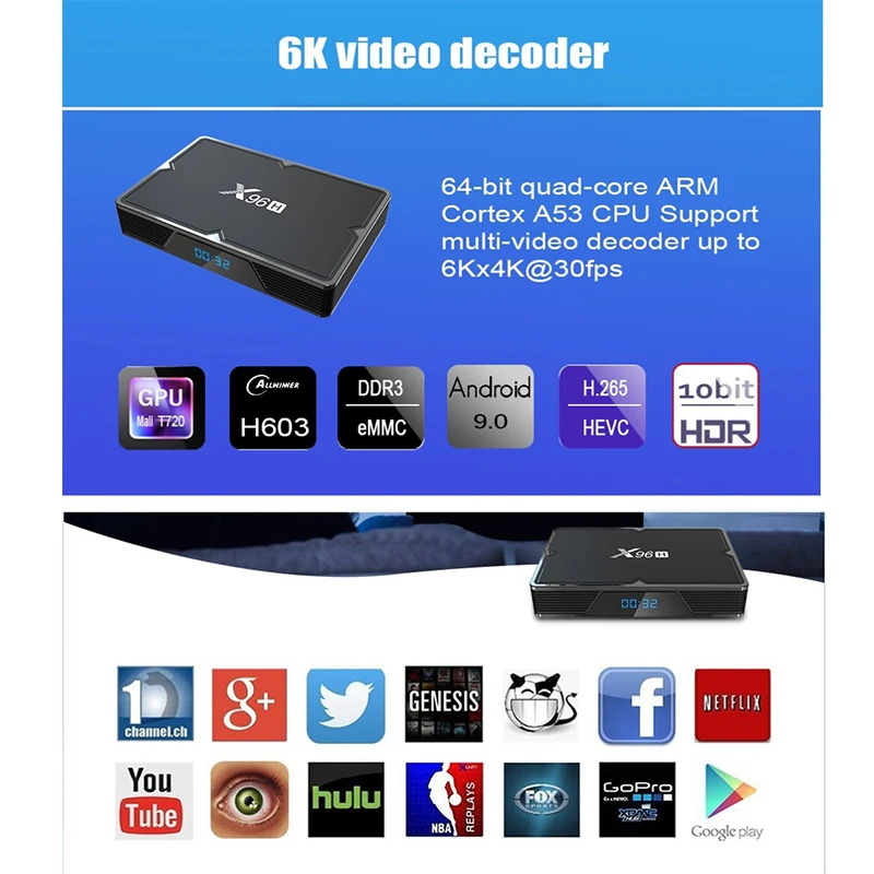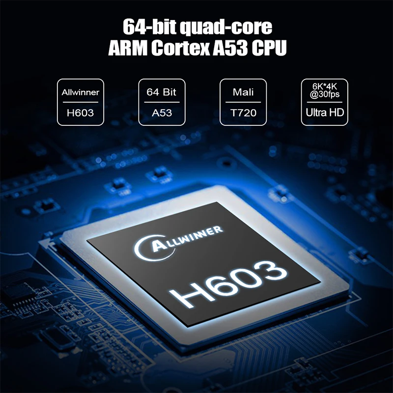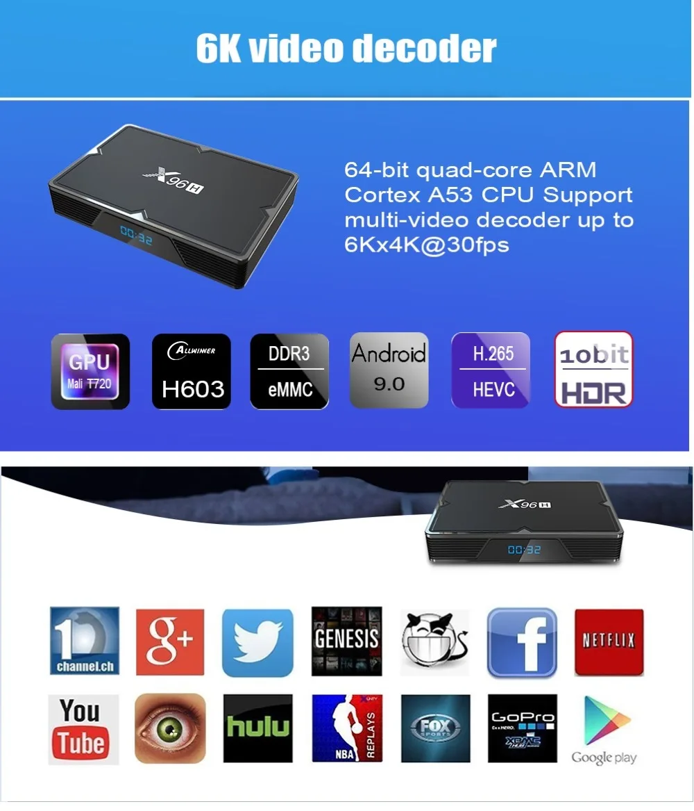1.ОС Android 9,02. Процессор: H603 четырёхъядерный 64-разрядный процессор ARM Cortex- A533.GPU: Высокопроизводительный многоядерный GPU Mali T7204. Поддержка USB3.0 USB2.0 USB1.05. Поддержка 10/100M Ethernet5. Есть три варианта коробки X96H: