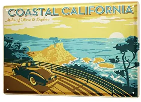 Жестяная вывеска Декор бляшек мир туда и обратно Калифорния прибрежных дорожный автомобиль морской закат декоративная настенная панель 8X12