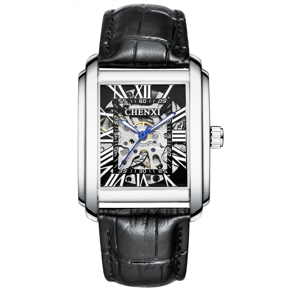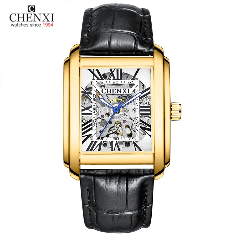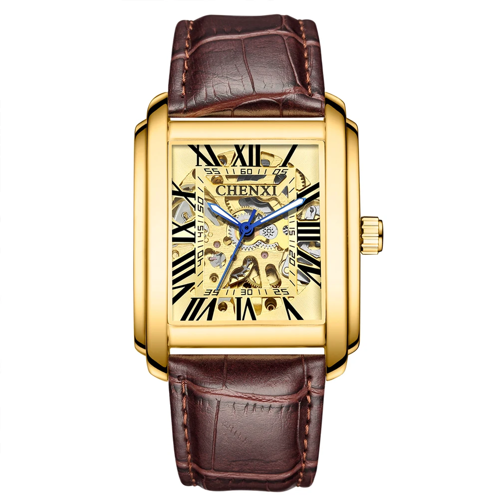 Часы наручные CHENXI Мужские механические, модные повседневные деловые, с кожаным ремешком, с перфорацией, с золотым циферблатом