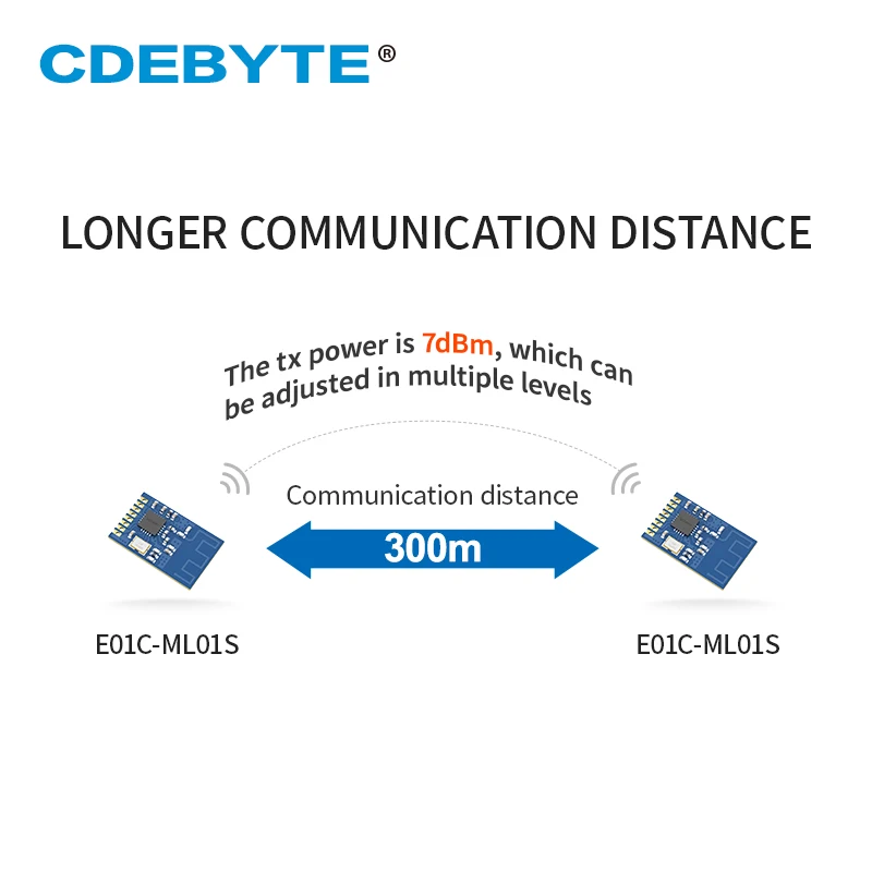 Основные параметры Значение Примечания Мин. Типичный Макс. Рабочее напряжение (В) 2,0 3,3 3,6 ≥ 3,3 V обеспечивает выходная мощность Уровень связи (V) - 3,3 - Для TTL 5 В может быть риск сжигания Рабочая температура (℃) -40 - 85 Промышленный дизайн Рабочая частота (МГц) 2,4 - 2,525 Поддержка ISM band Ток TX (мА) - 12 - 0dBm Ток RX (мА) - 15 - - Ток сна (μA) - 0,7 - Программное обеспечение выключено Максимальная мощность Tx (дБм) - 7 - - Чувствительность приема (дБм) - -83 - Скорость передачи данных по воздуху составляет 250 кбит/с Скорость передачи данных по воздуху (bps) 250k - 2 м Контролируется с помощью программирования пользователя Основной параметр Описание Примечания Расстояние для справки 300 м Тесты состояние: четкий и открытой местности, коэффициент усиления антенны: 5dBi,antennaheight: 2,5 м, скорость передачи данных: 250 кбит/с FIFO 32 байта Максимальная длина, передаваемая каждый раз Кристальная частота 16 МГц - Модуляция GFSK - Посылка SMD - Соединитель 1,27 мм - Интерфейс связи SPI 0-10Mbps Размеры 12*19 мм Без SMA Антенна Антенна PCB Сопротивление 50 Ом[Введение]:E01C-ML01S представляет собой маленький размер модуль поверхностного монтажа на основе Si24R1, работает при температуре не выше 2,4 ГГц с антенной на печатной плате с использованием промышленного класса Высокоточный 16 МГц кварцевый генератор. Производительность ИТ-оборудования и выбор компонентов во время исследований и разработок соответствуют стандартам промышленного класса.