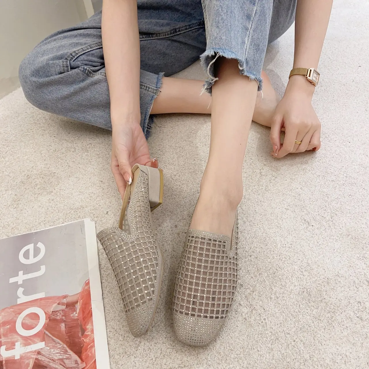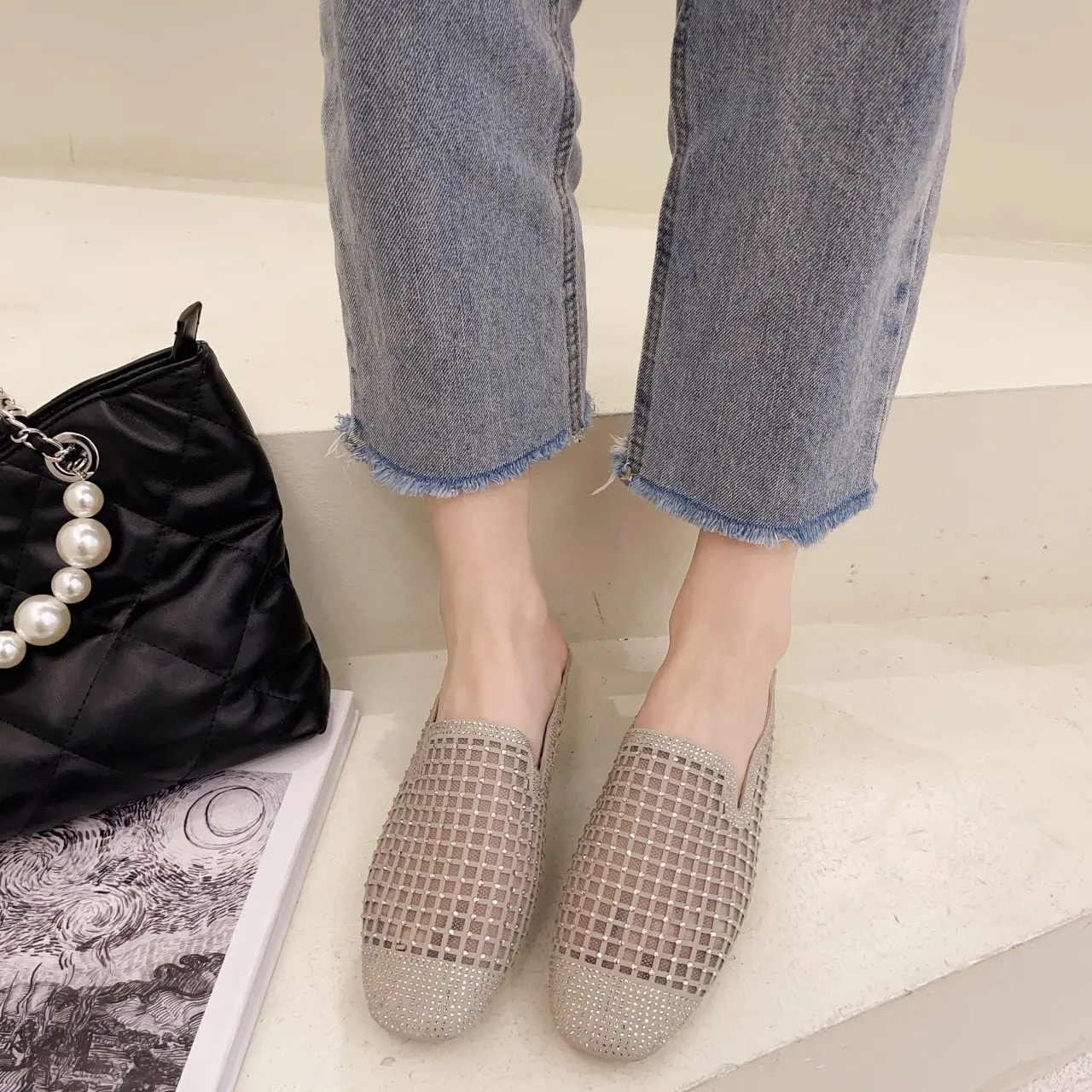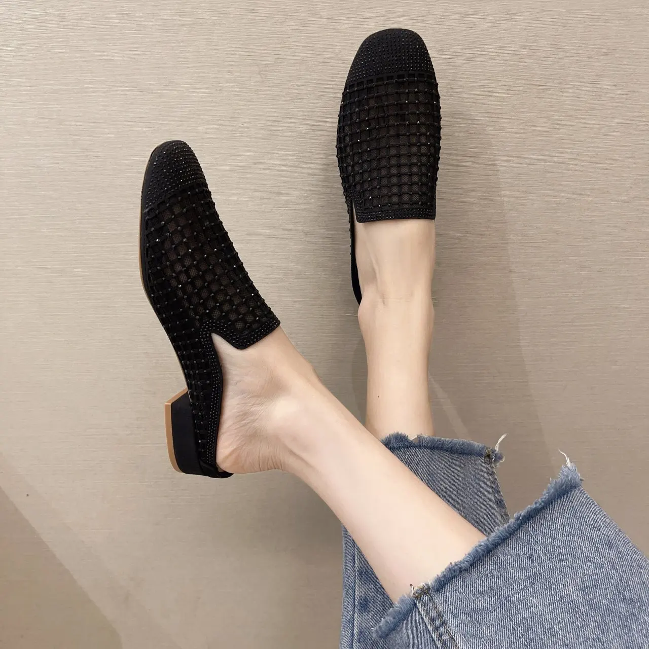 Женские ажурные сетчатые шлепанцы, винтажные туфли-лодочки с квадра...