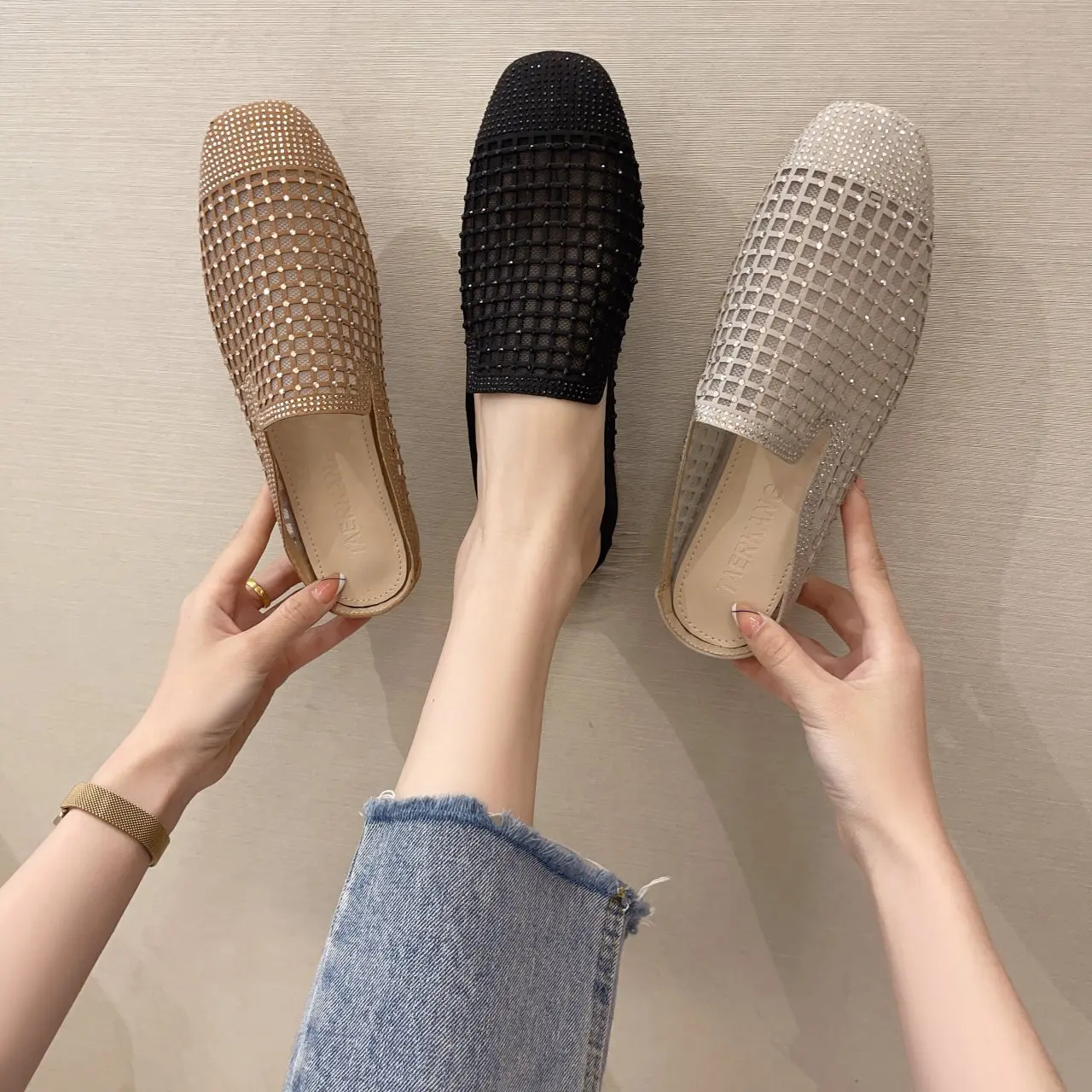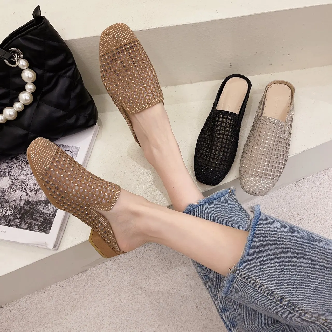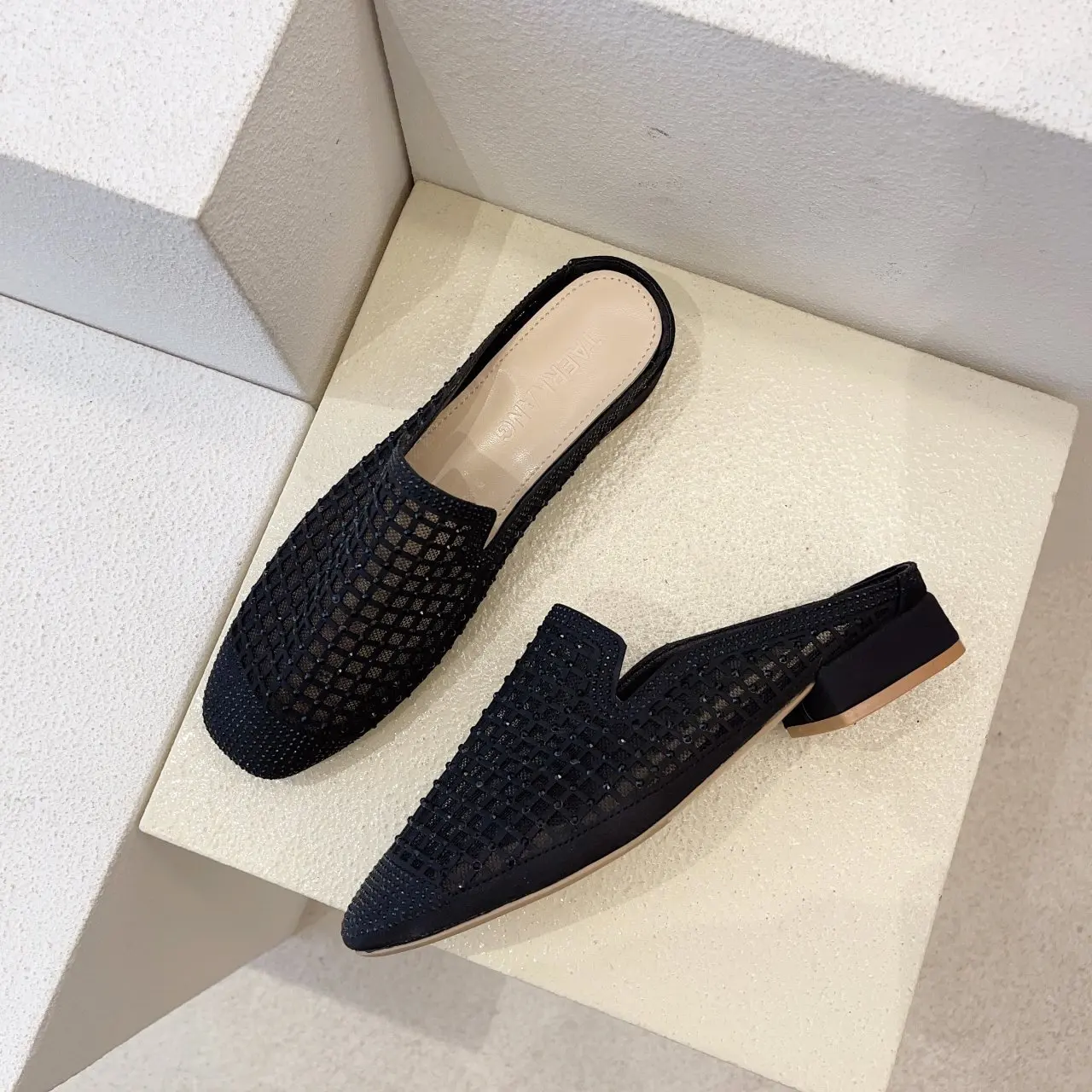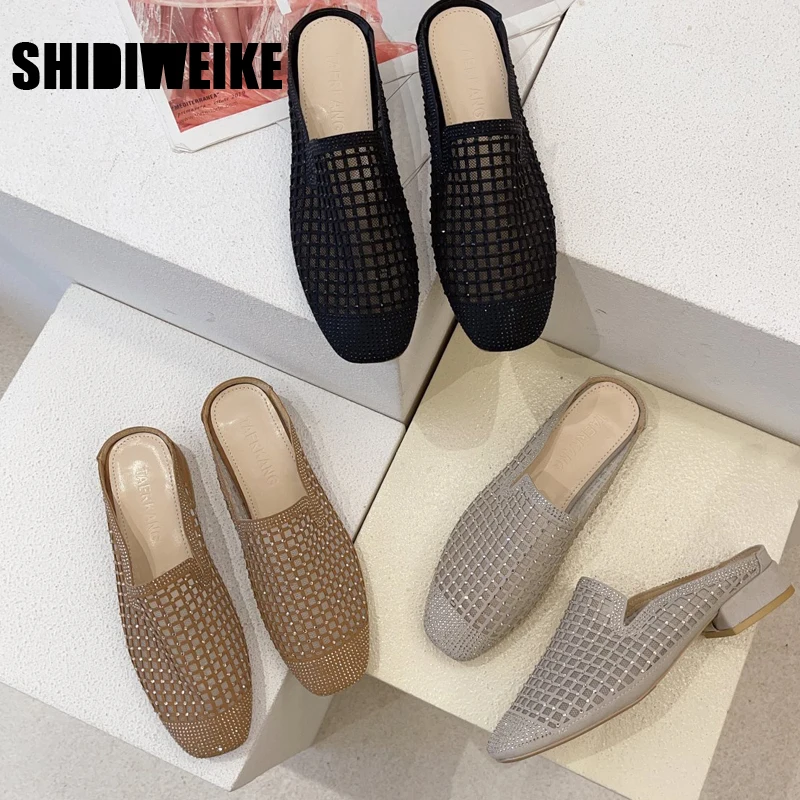 Мюли женские сетчатые на высоком каблуке, дышащие шлепанцы с квадратным носком, со стразами, вязаная обувь, vc447, лето 2021