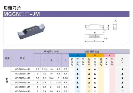 LF6018: специальные сорта для обработки нержавеющей стали, ультра-тонкие сплавы, с отличной прочностью и устойчивостью к адгезии к покрытию, подходит для обработки нержавеющей стали, особенно из аустенитной нержавеющей стали, А также подходит для резки жаростойкой легированной стали на низких скоростях.K10: подходит для обработки алюминия и медиLF6008: подходит для обработки общих материаловLF6028: подходит для стальных деталей