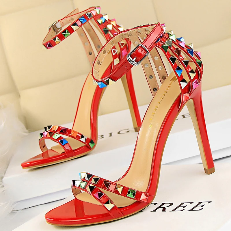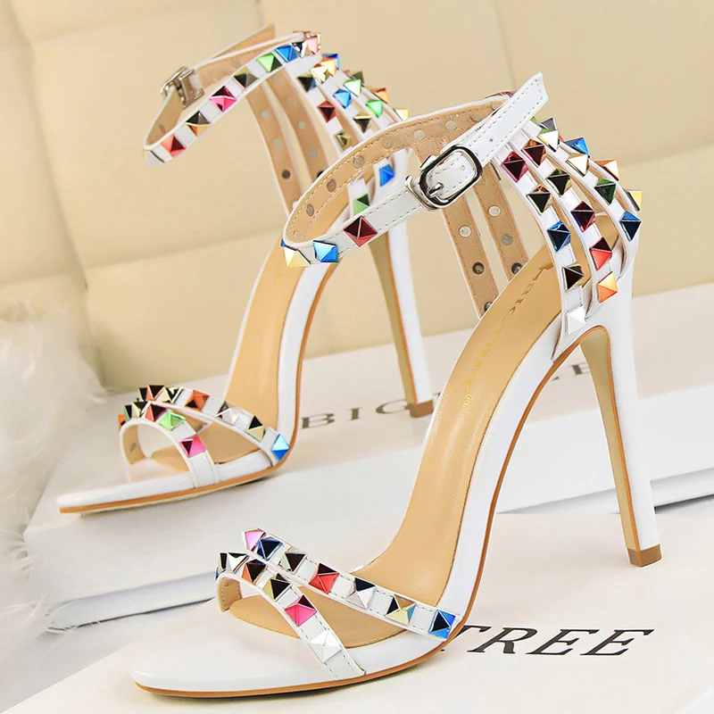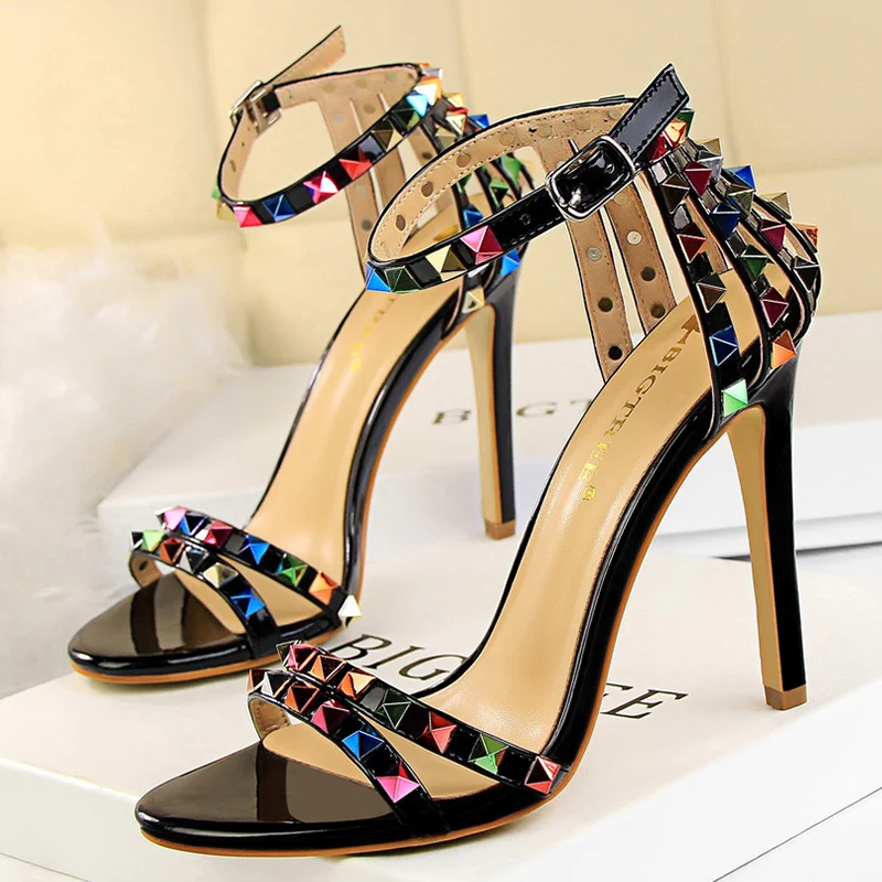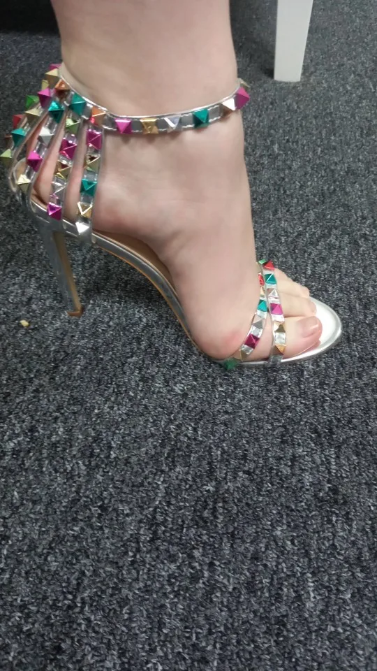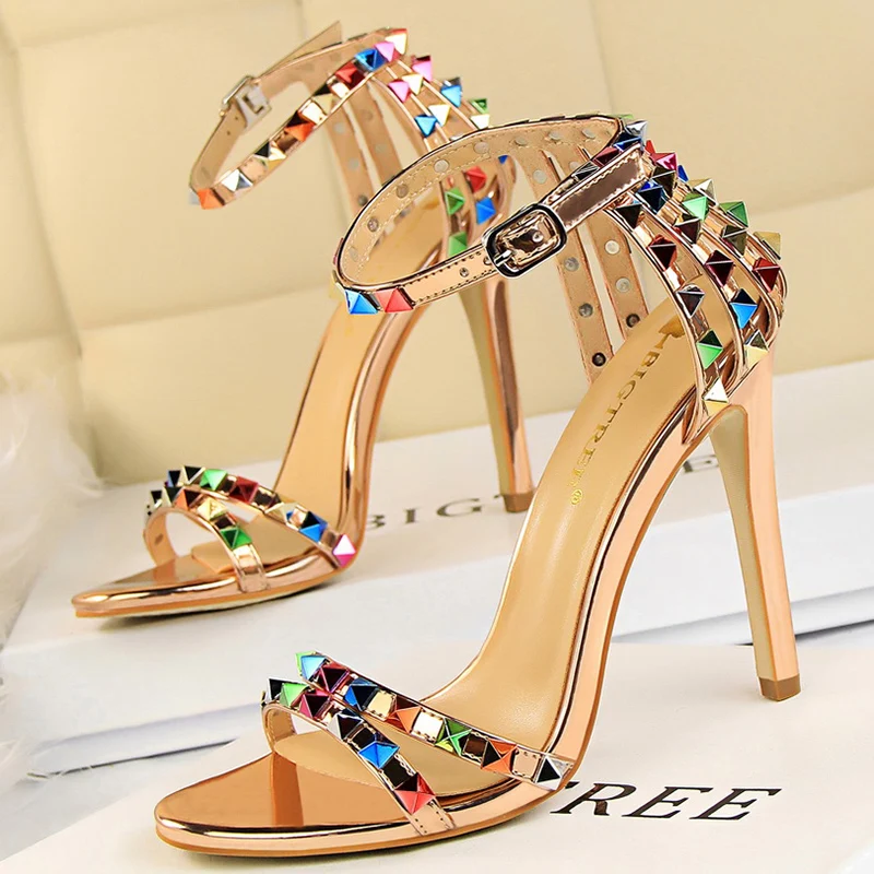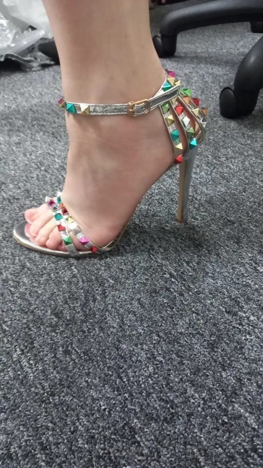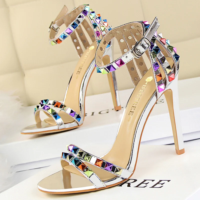 2021 летняя дизайнерская женская обувь на высоком каблуке 11 см для стриптиза на высоком каблуке вечерние босоножки в римском стиле, с открытым носком с заклепками сандалии тренд сеткаСеребристая женская обувь