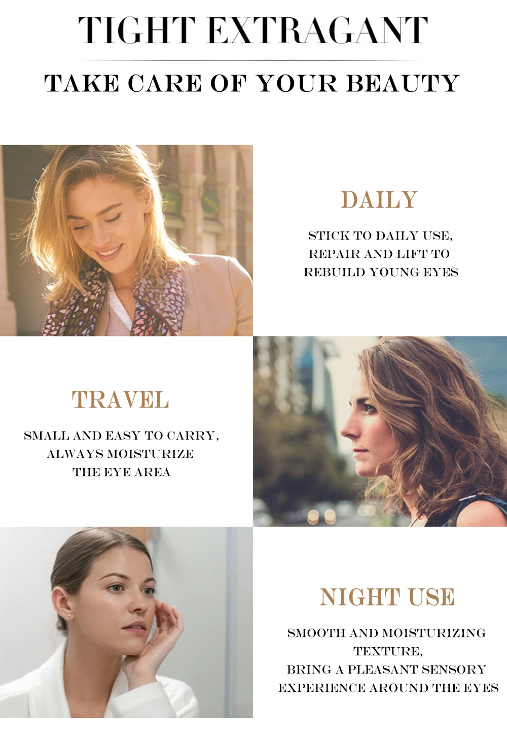 Плотный экстрагантПозаботьтесь о своей красотеЕжедневный -- Придерживайтесь ежедневного использования, ремонт и подъем, чтобы восстановить молодые глазаПутешествие-маленький и удобный в переноске, всегда увлажняет область вокруг глазНочь usen-гладкая и увлажняющая текстура, приносит приятный сенсорный опыт вокруг глаз