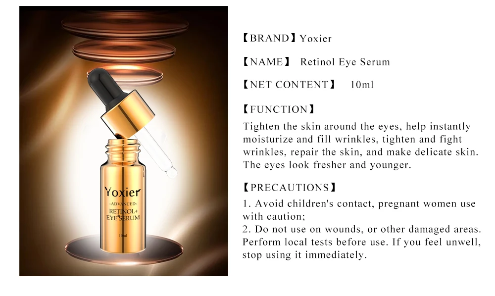 【Brand】 yoxier【Name】Retinol глаз Сыворотки【Net content】 10 мл【Function】 подтяните кожу вокруг глаз, мгновенно Увлажняйте и заполняйте морщины, затягивайте и Боритесь с морщинами, восстанавливайте кожу и создавайте нежную кожу. Глаза выглядят свежее и моложе. 【Precau】 】 1. Избегайте контакта с детьми, беременным женщинам следует с осторожностью;2. Не используйте на ранах или других поврежденных местах. Перед использованием выполняйте местные тесты. Если вы чувствуете себя плохо, прекратите использовать его немедленно.