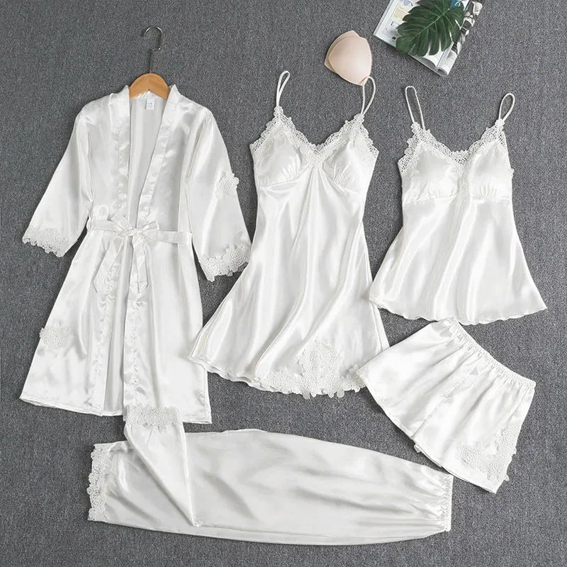 Пижамный костюм, пикантный комплект из пяти предметов, белая кружевная отделка, Свадебный комплект, халат, кимоно, Тонкая шелковая пижама, домашняя одежда