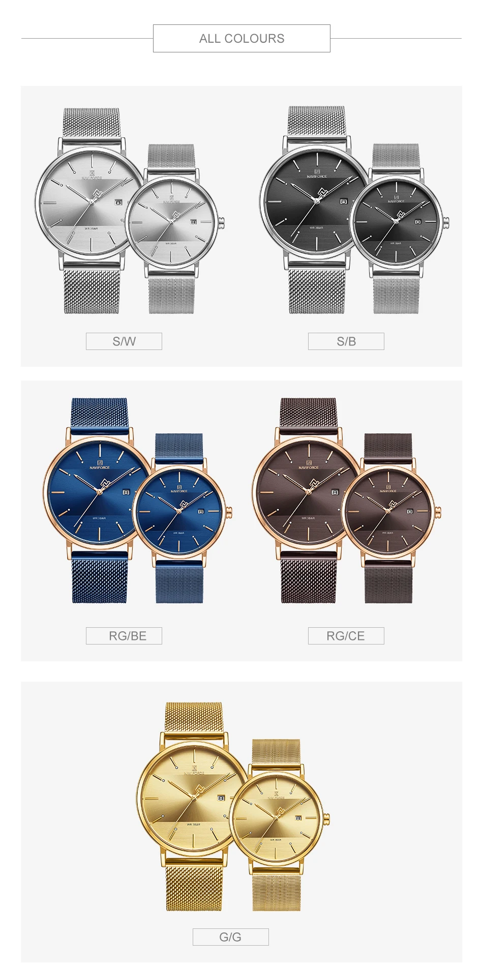 Часы наручные NAVIFORCE для влюбленных, кварцевые модные деловые мужские и женские, стальные, кофейные, золотые
