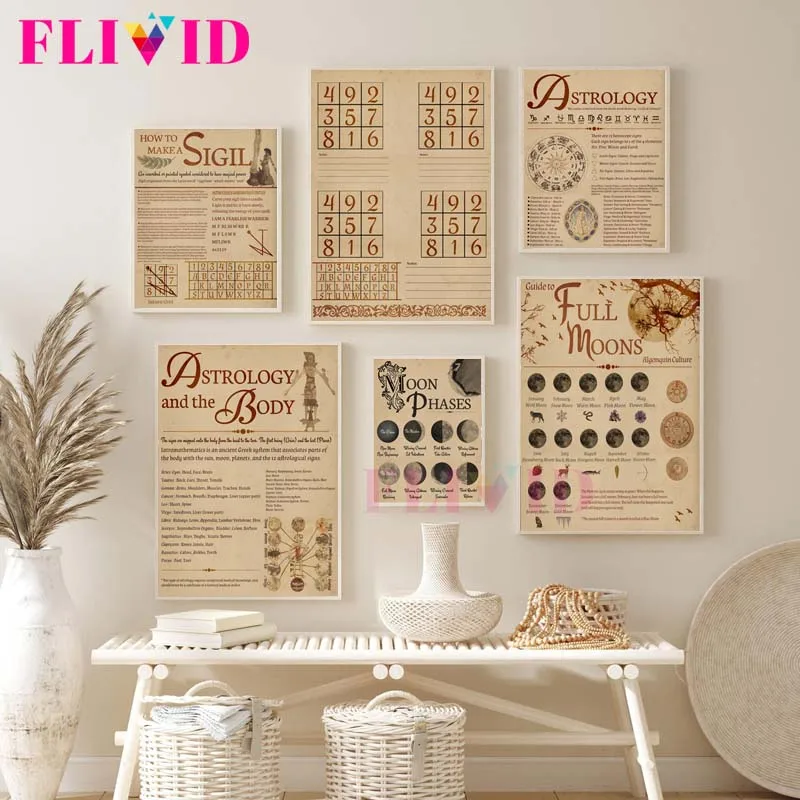 Винтажные плакаты, астрологические страницы, живопись на холсте, со...