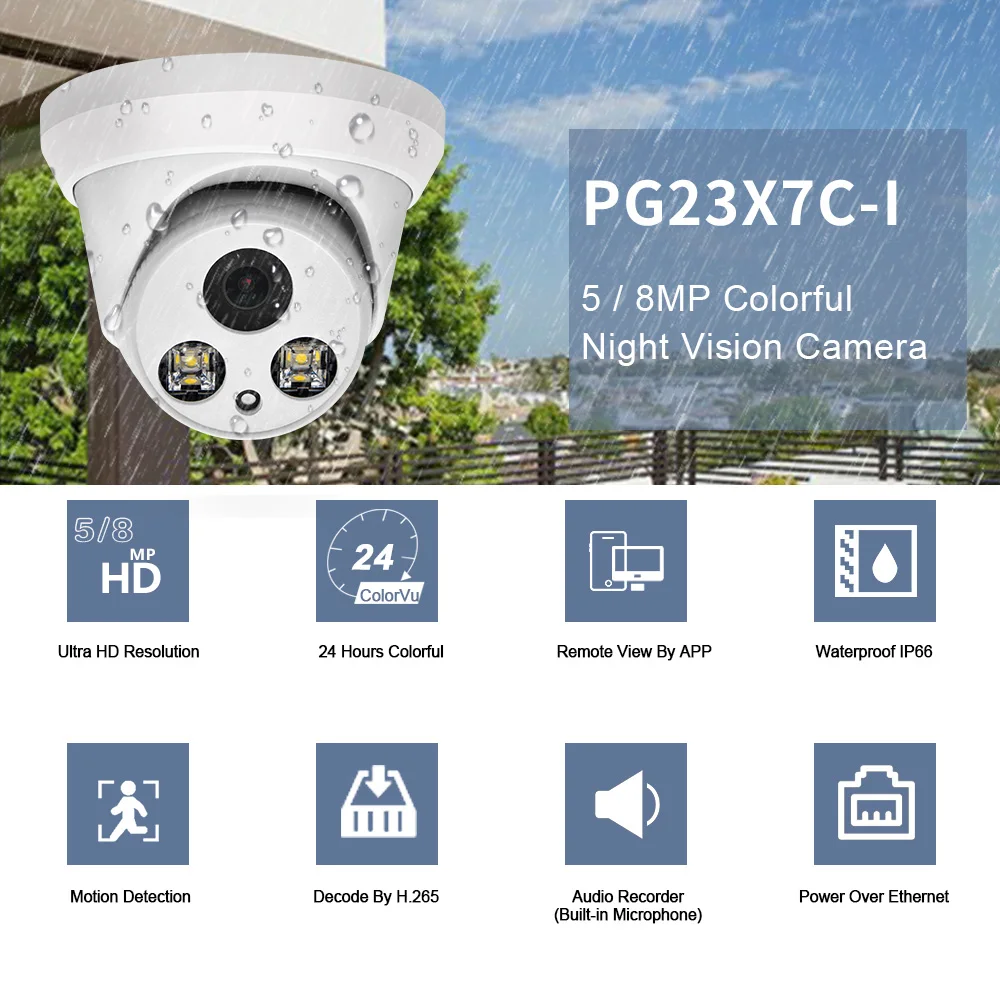 IPC-2357C· 1/2.8” 5Megapixel CMOS·24hours full color night·Max. 15fps@5MP,20fps@4mp·H.265/H.264 dual-stream media server·Support PoE·Compatibility: HIKVISION,ONVIF,RTSP·Multi web browser, PC Client, mobile APP remote accessIP67 waterproof