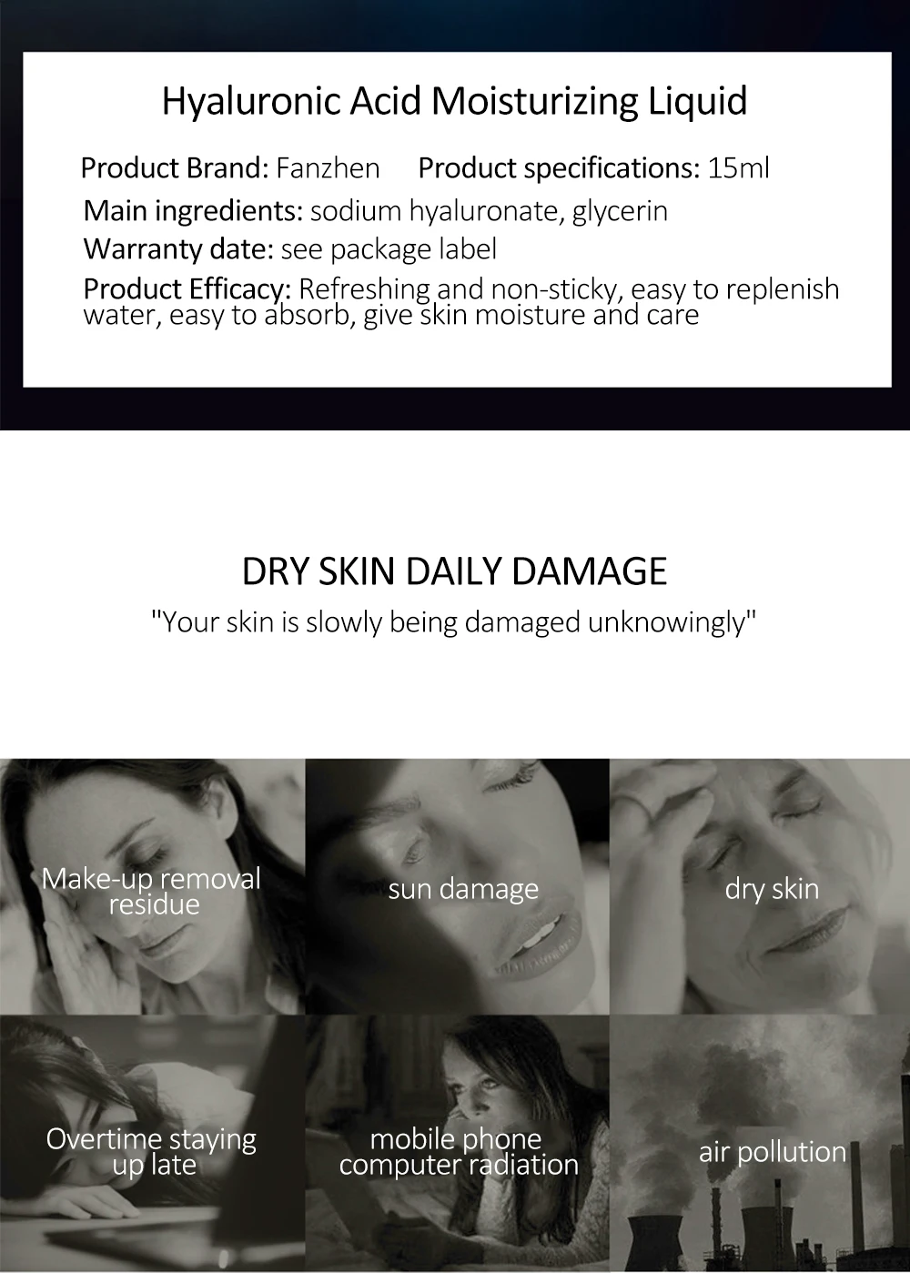 Основные ингредиенты: гиалуронат натрия, глицеринХарактеристики Товара: 15 млЭффективность продукта: освежает и не липнет, легко наполняет воду, легко впитывается, придает коже влагу и уходДата гарантии: см. Этикетку посылка-Ежедневное повреждение сухой кожи"Ваша кожа медленно повреждается неосознанно"Остатки для снятия макияжа/повреждения от солнца/сухая кожаСверхурочные задержки/мобильный телефон компьютерное излучение/загрязнение воздуха