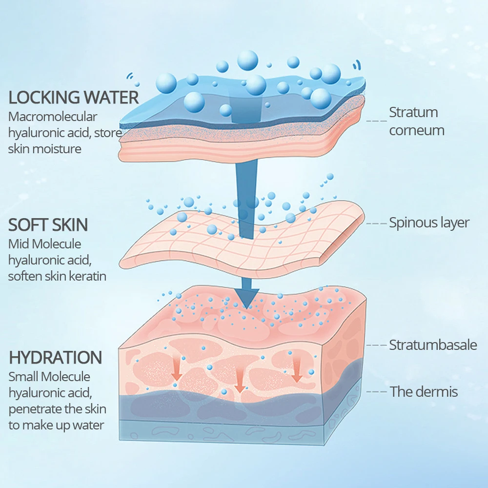 «Эссенция восполняет влагу и способствует впитыванию, обеспечивая эффективный уход за кожей»Сочетание делает увлажнение более эффективнымГиалуроновая кислота эффективно попадает во все слои кожиКожа наизнанку, интенсивное увлажнение действительно меняетсяХорошо защищает кожу от нехватки воды и создает влагозащитный барьер-Малая молекула гиалуроновой кислотыПоверхность кожи образует увлажняющую защитную пленку-Гиалуроновая кислота средней молекулыПроникает в роговой слой, увлажняет и ухаживает за кожей-Макромолекула Гиалуроновая кислотаПроникает в дерму, восполняя воду и способствуя впитыванию
