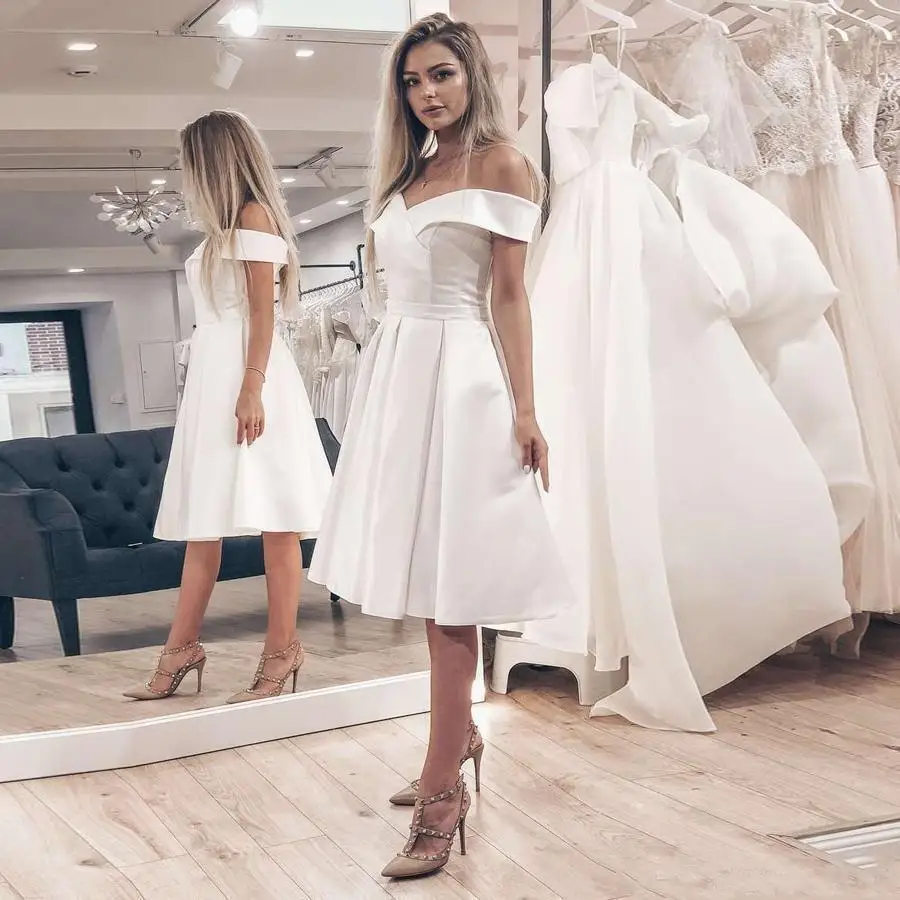 Белое платье с открытыми плечами и Свадебные платья А Дешевое Короткое свадебное платье до колена Длина Сатиновые Свадебные платья Robe De Mariage