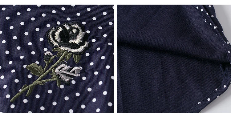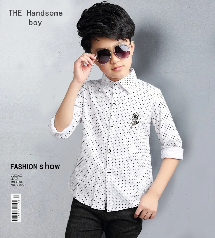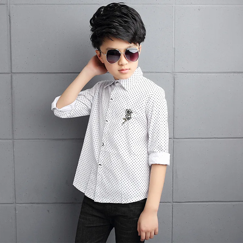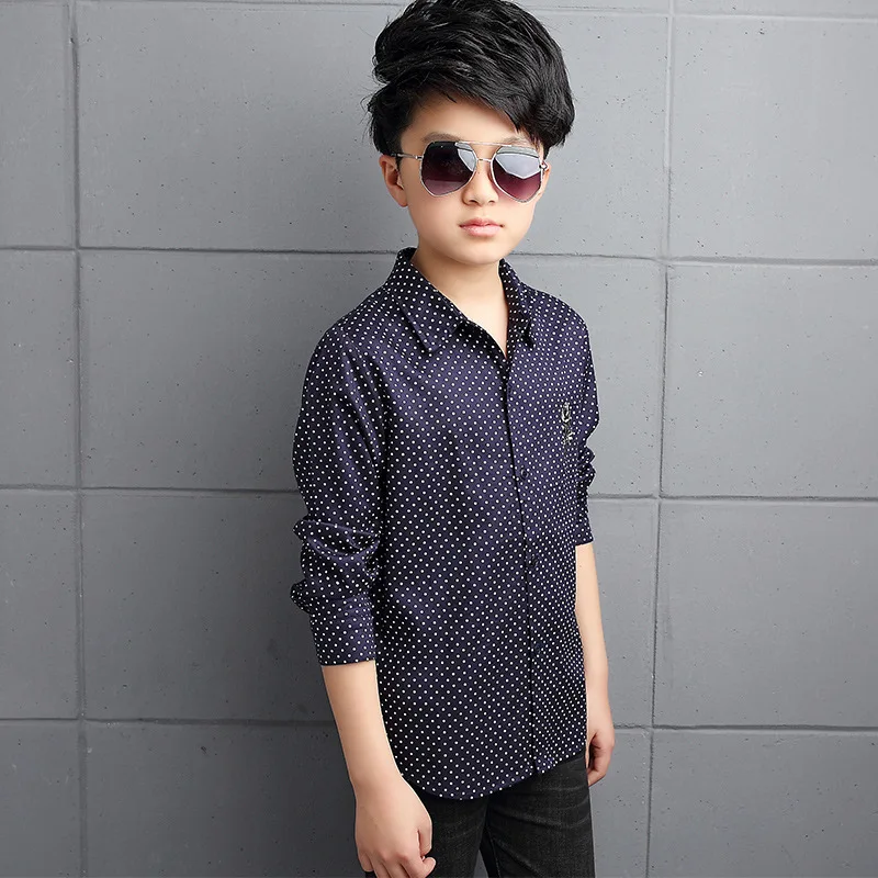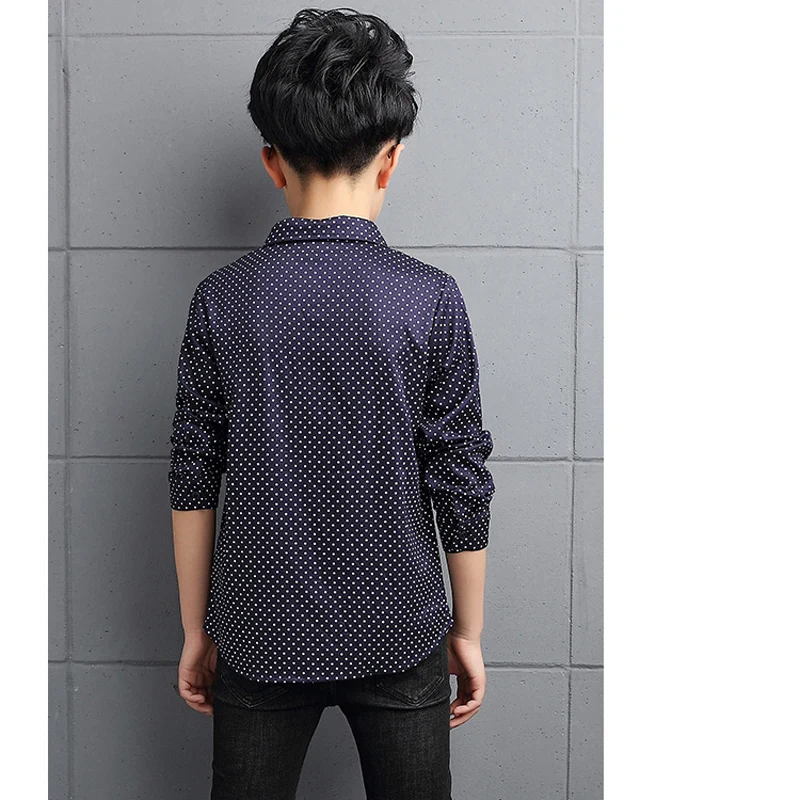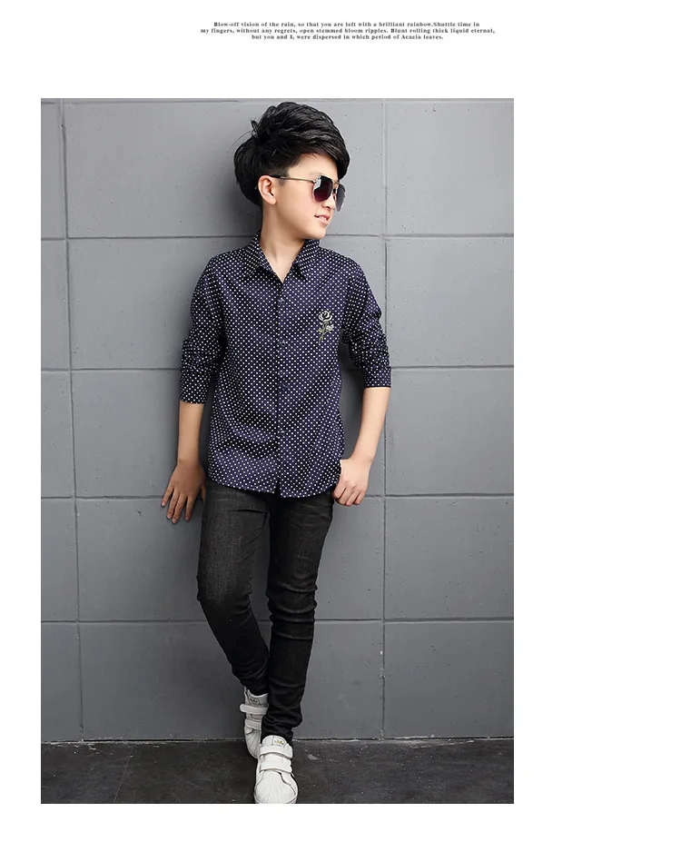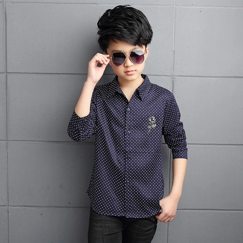 Рубашка для мальчиков, весенняя, темно-синяя, в горошек, с длинным рукавом, для подростков, модная, детская одежда, для мальчиков 8-12 лет, рубашка с цветочной вышивкой