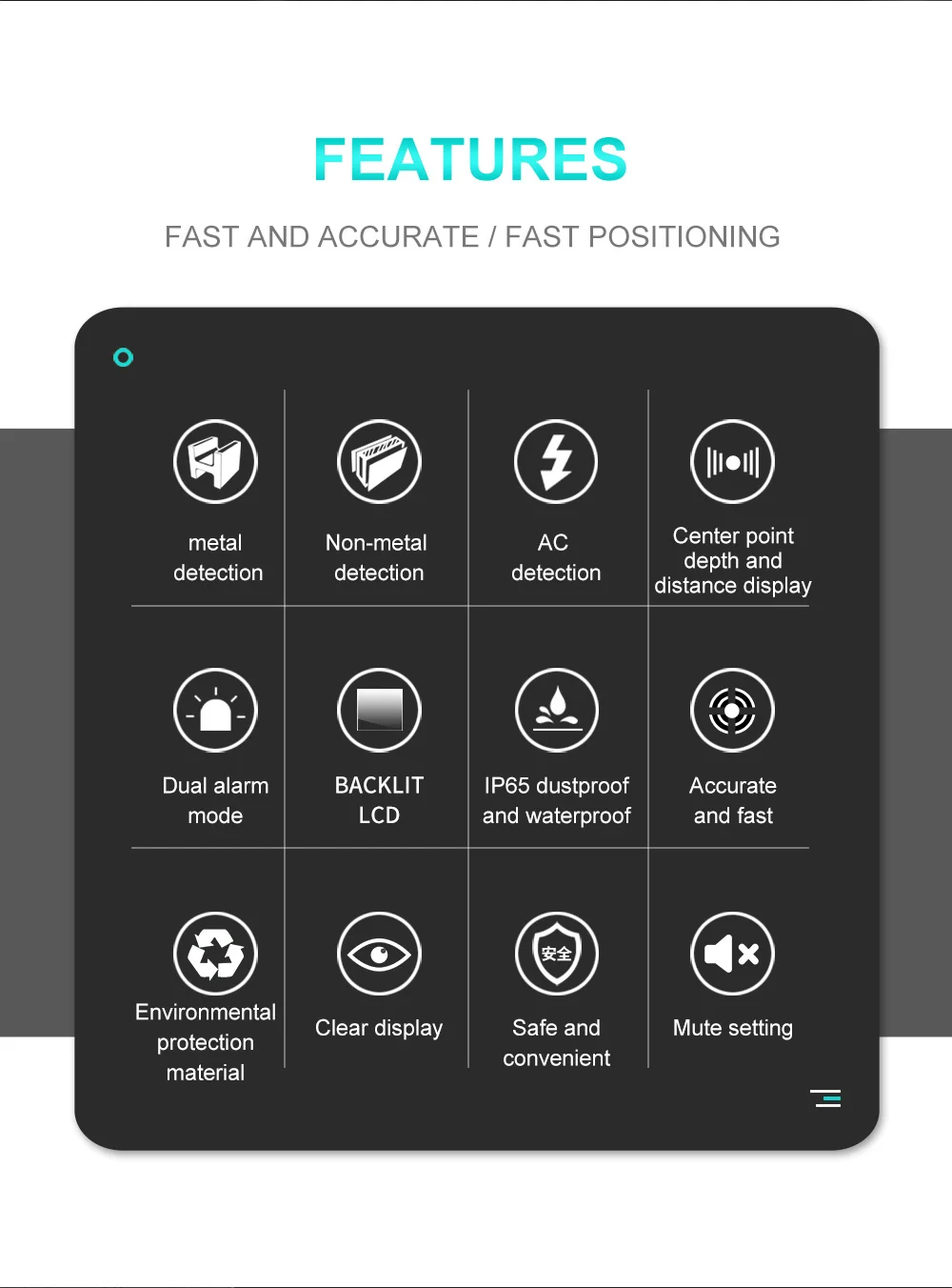 Примечание:1. В режиме обнаружения металла, устройство будет читать глубину в лучшей точности, когда измеряемый объект является арматурным стержнем диаметром 20 мм, в противном случае, значение только для вашей справки.2. При всех режимах обнаружения при обнаружении провода срабатывает предупреждение.3. В неметаллическом режиме обнаружения устройство должно быть тесно прикасается к измеренной поверхности. Это требует повторной калибровки, если устройство поднято во время работы. Нажмите неметаллическую кнопку измерения для повторной калибровки.4. Результат обнаружения зависит от материала обнаруженного объекта, размера объекта, материала и состояния поверхности обнаружения.Если кабель не заряжен, глубина обнаружения уменьшится.О доставке:1. Аккумулятор не может быть отправлен из-за управления воздушным движением.2. Как правило, посылка будет отправлена в течение 1-3 дней после подтверждения оплаты.3. Пожалуйста, убедитесь, что ваш адрес заполнен, транспортная компания может отправить только полный и подробный адрес.4. Если вы не получили свою посылку в течение 30 дней после оплаты, пожалуйста, свяжитесь с нами. Мы Отследим товары и ответим вам как можно скорее. Наша цель-удовлетворить клиентов!