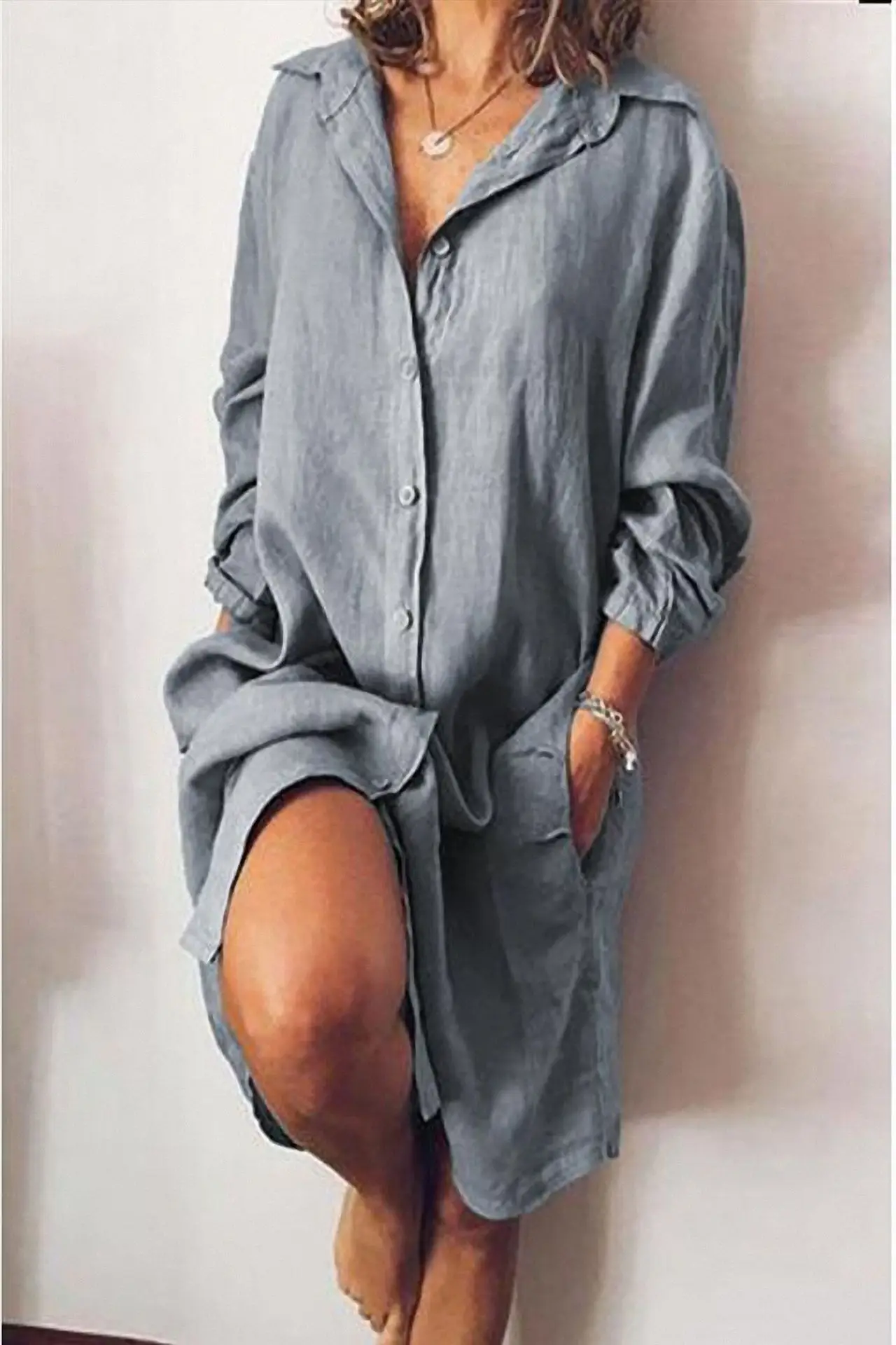 Женское Хлопковое платье-рубашка с отложным воротником и длинным рукавом