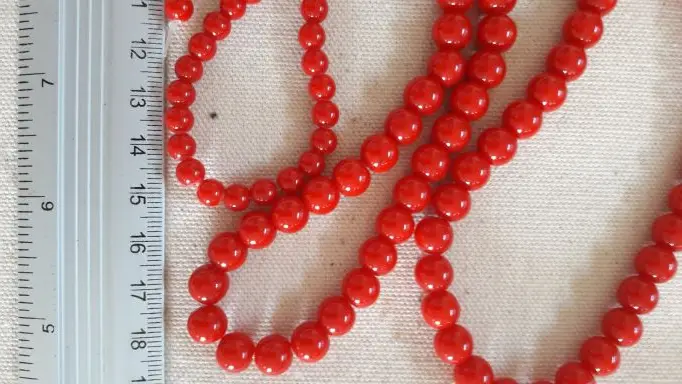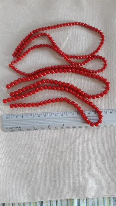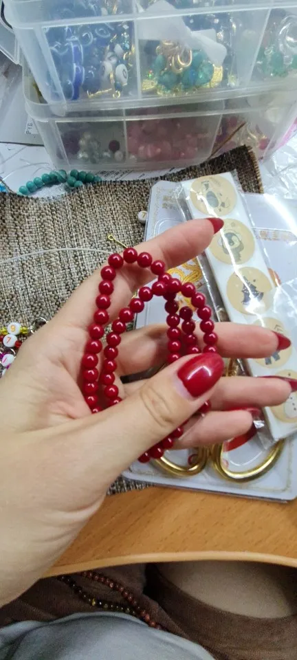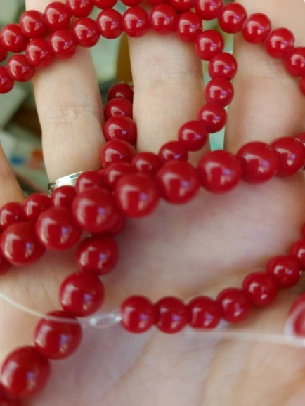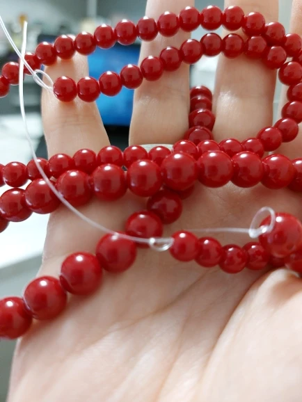 Очень красивые бусинки. Брала под рябинку, самое оно. Не прозраные, цвет глубокий, насыщенно-красный. Полностью соответствует описание и фото. По качеству, тяжелые, не как изакрила или пластика.На нитке больше заявленного количества (приятный бонус). В общем, я довольна на 100%. Рекомендую!