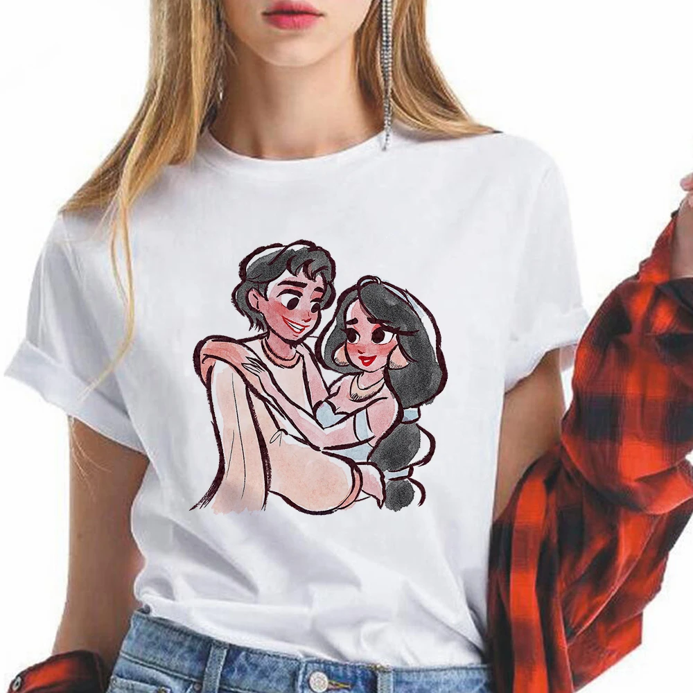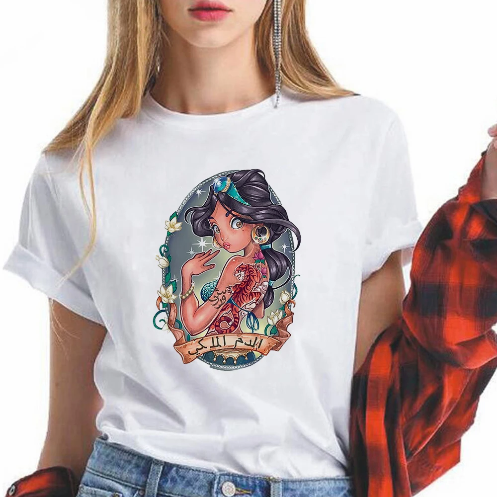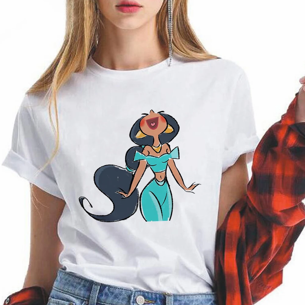 Футболки для девочек, летние модные женские топы, Повседневная футболка с коротким рукавом и круглым вырезом, Диснеевские принцессы, жасмин, Аладдин, футболки с принтом
