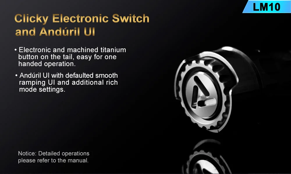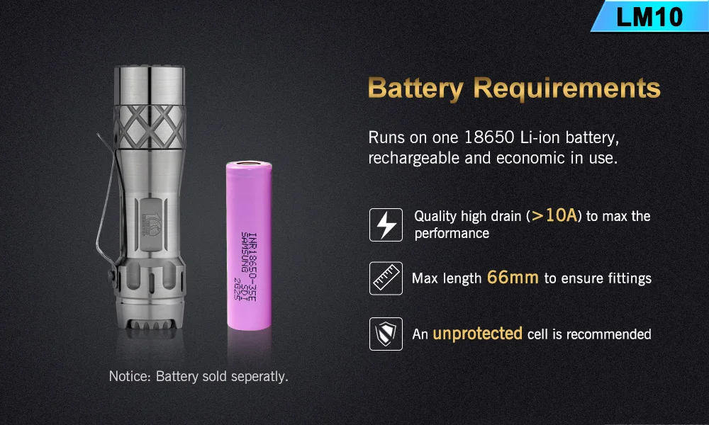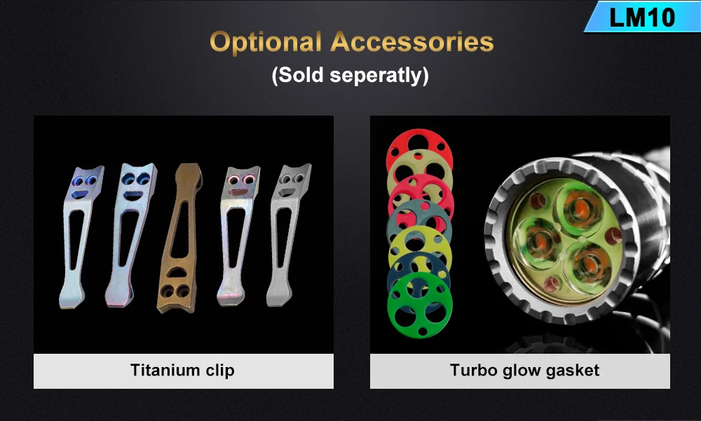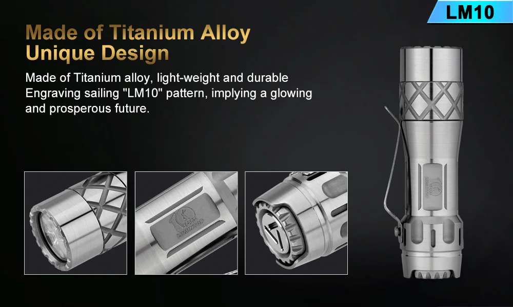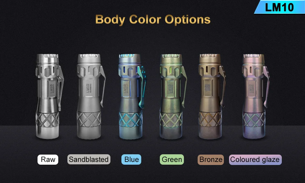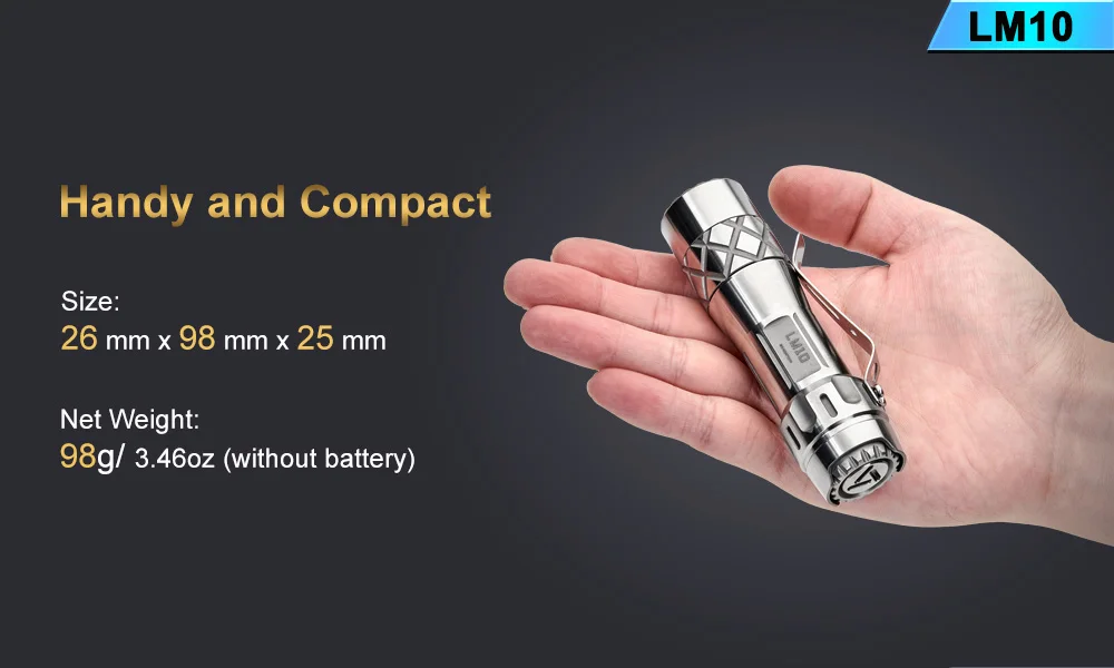 Emitter: Three LEDs on a copper DTP MCPCB. Optic: Standard TIR optical lens . Flux: 2800lumens Intensity: 10000 cd ANSI throw 200meters. Firmware: The LM10 uses free software called Anduril User Interfaces: By default the LM10 is set to use SMOOTH RAMPING, instant access to TURBO mode is also provided. A more conventional steeped ramping UI is available if you like discrete modes level. You can choose how many steps you want. Momentary mode is useful for signaling purposes or rapidly/briefly lighting up targets. Muggle Mode uses a reduced output. It has an electronic LOCKOUT for safety, but acts also as momentary low light. Other function: Battery check; sunset; beacon. Tactical strobe. Party strobe, bike flasher, candlelight, lightning storm. Battery: One flat-top 18650, An unprotected cell is recommended. Max length 66mm. battery is not included . Driver: FET+7+1 Driver. Low parasitic drain while OFF. Switch : Electronic tail switch. Ingress rating: Equivalent to IPX8 Weight: about 98g without battery. Size: 26mm(head) *98mm (length)*25mm(tail)