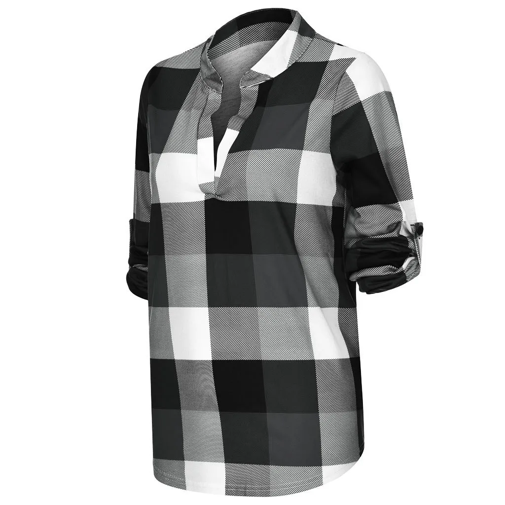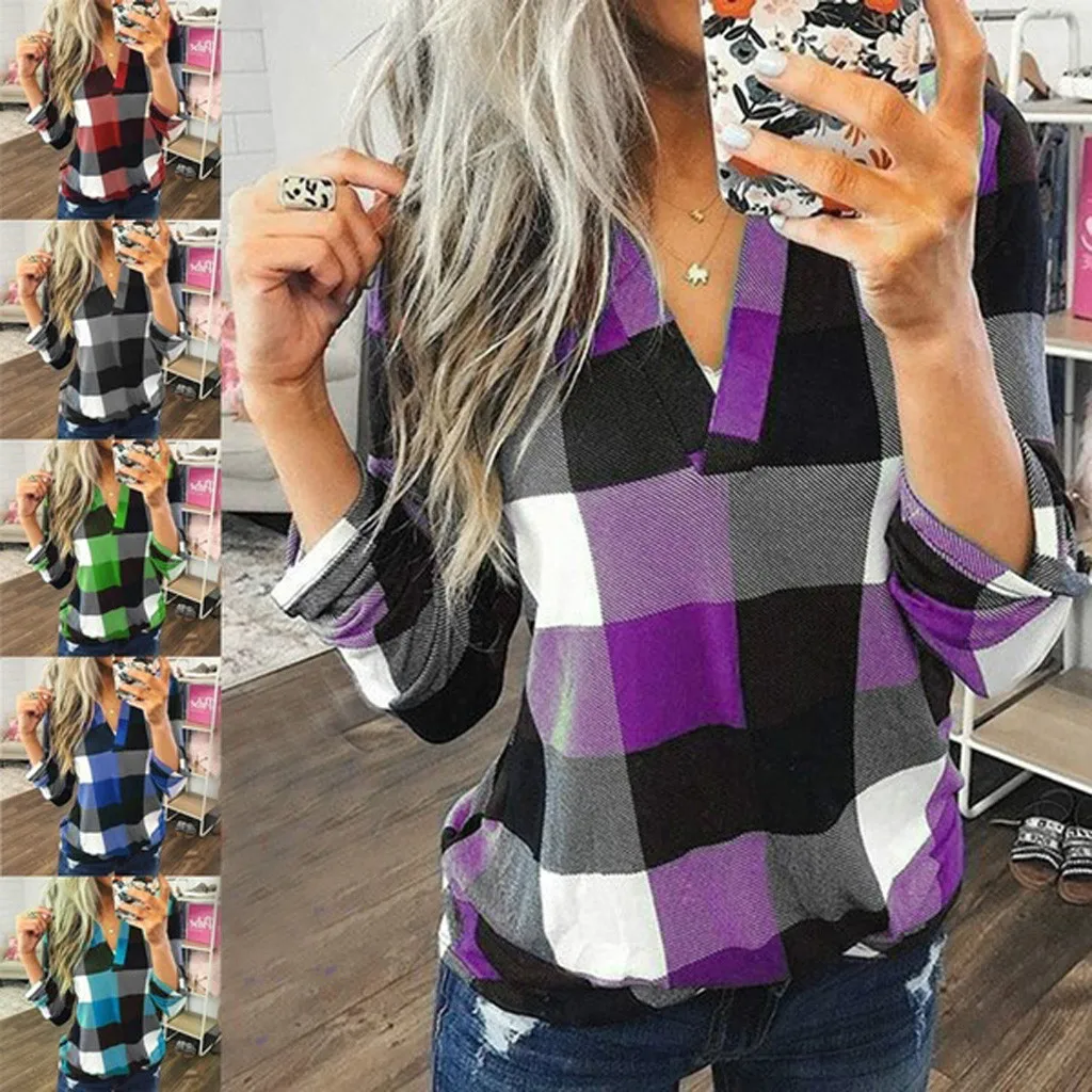 Для женщин с v-образным вырезом рубашка в клетку решетки Рубашки в клетку Топы Леди футболка с длинными рукавами рубашка топы размера плюс S-3xl 2021