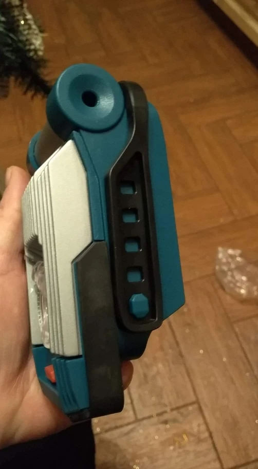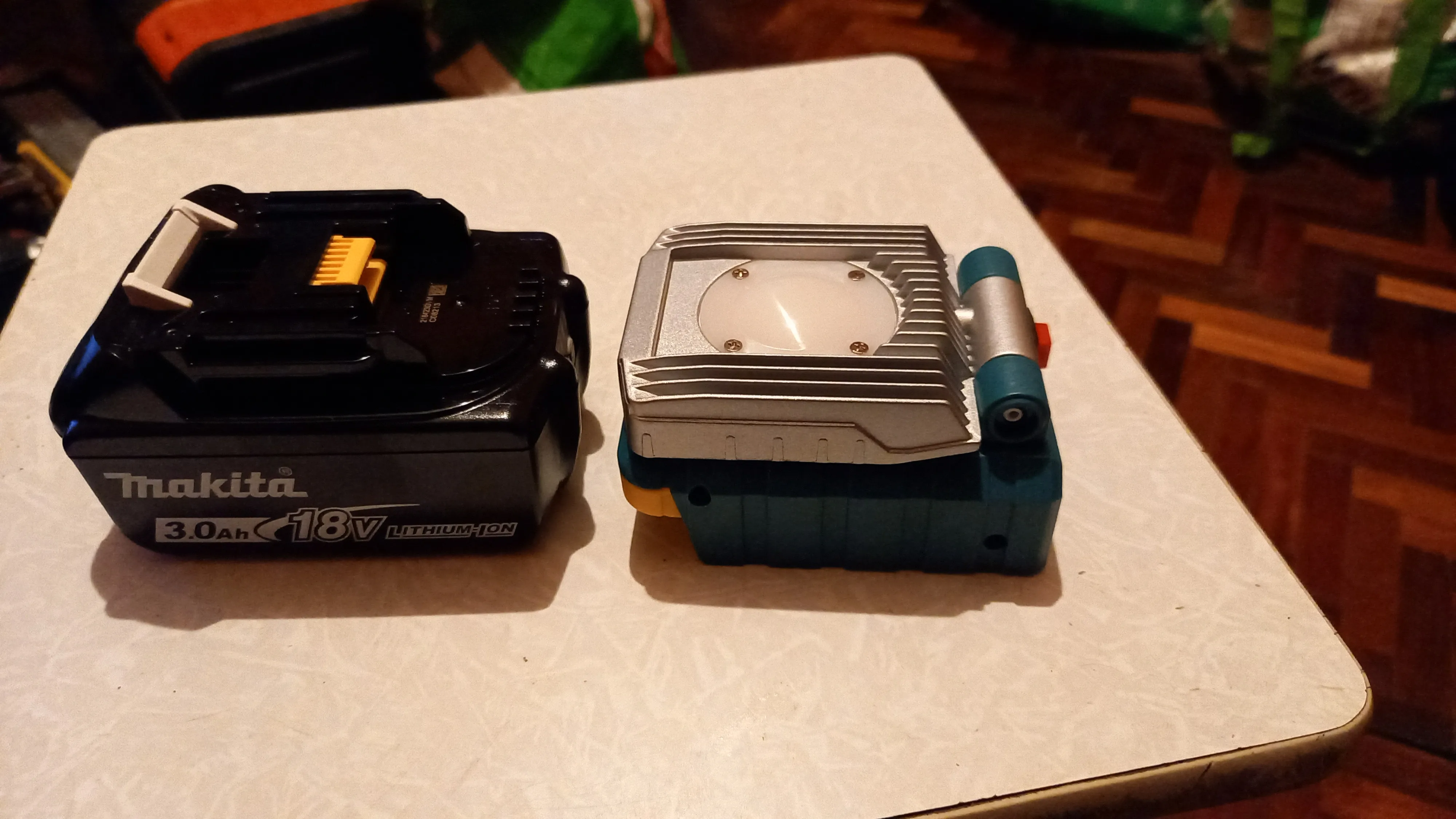 Светит как лампа накаливания на 100-150 ватт, офигенная вещь под батарею Макита 18 вольт, размер чуть меньше самой батареи. Для работ в помещениях без света подходит просто супер! Кнопка включения работает в двух режимах: "легкий прижим" - свет "по требованию", клик на кнопку - свет постоянный. Можно использовать вместо фонарика.