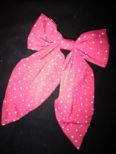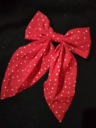 Бант из искусственной ткани, края не обработаны. Крепкая заколка, держится хорошо. Горошек на банте очень мелкий, его плохо видно. Доставка быстрая.