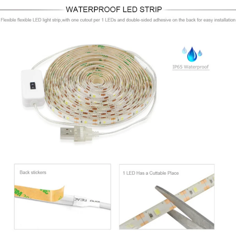 Тип переключателя: ручной датчик развертки цвет освещения: белый/теплый белый Цветовая температура: теплый белый (2800K-3000K)/белый (6000K-6500K) Тип светодиодов: 2835SMD Длина: 1 м/2 м/3 м/4 м/5 м напряжение: DC5V Адаптер питания: питание от USB Расстояние обнаружения: 2-5 см CRI:>85