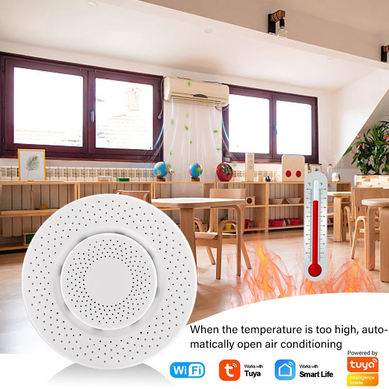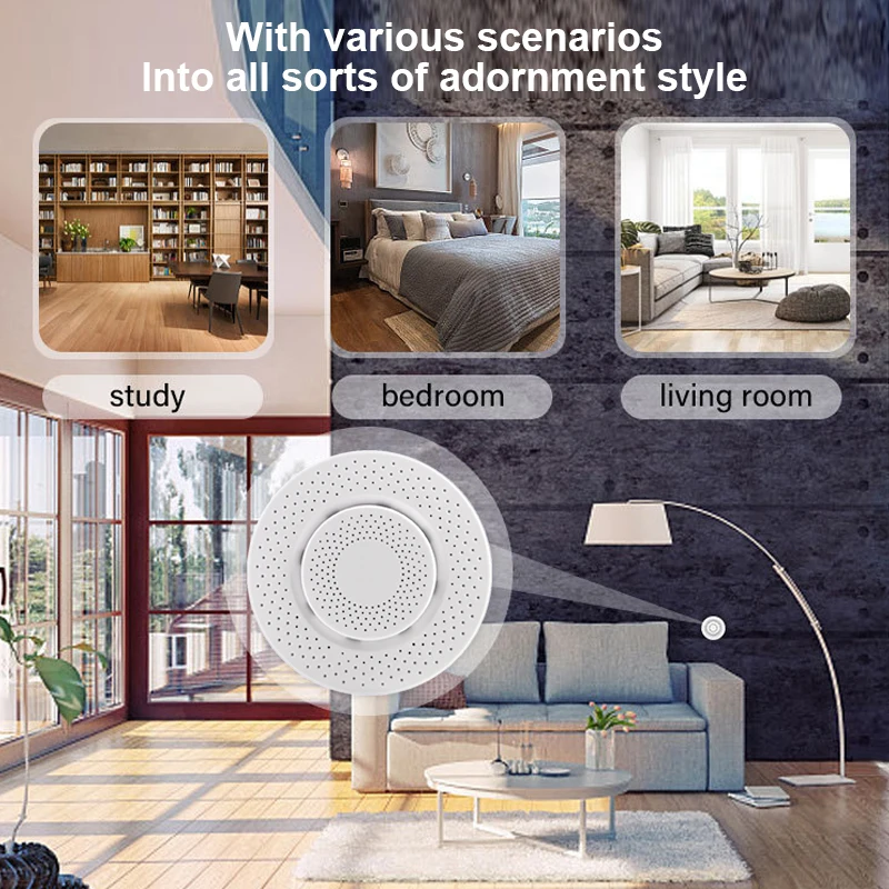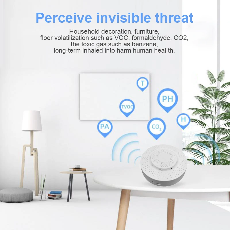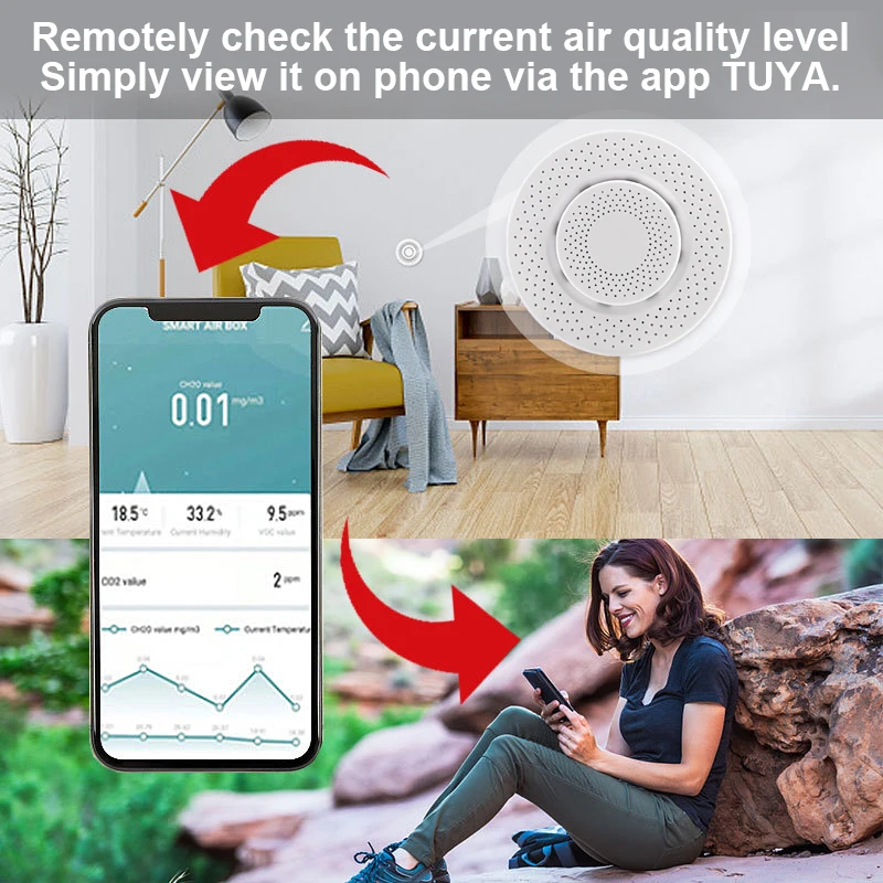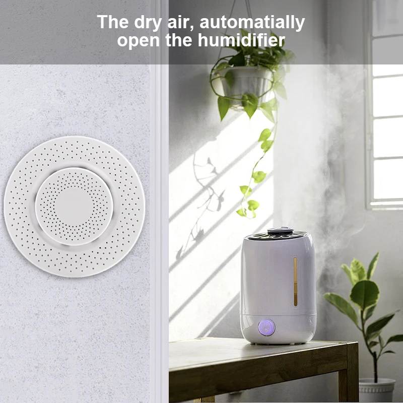 После подключения к приложению, он может быть связан с различными продуктами smart home. Например, при обнаружении чрезмерного формальдегида/Лос умный очиститель воздуха автоматически включается; Когда превышен углекислый газ, Умный вентилятор свежего воздуха автоматически включается; Когда температура ненормальная, температура кондиционера автоматически регулируется; Когда влажность слишком низкая или слишком высокая, Смарт-увлажнитель будет включаться/выключаться автоматически; Когда определённый параметр будет обнаружен, чтобы превысить стандарт, на будильник будет отправлено сообщение (вышеуказанная функция умной связи должна быть совместима с продуктом smart home)