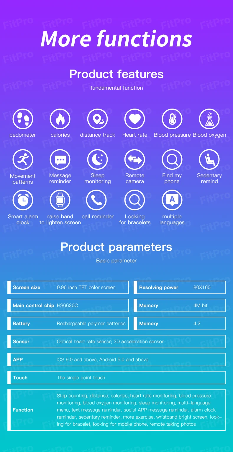 Спецификация: Тип: Смарт-часы M5 Материал: ТПУ, АБС-пластик, поликарбонат Язык: принимаются только английский или китайский Приложение: Fitpro (язык приложения является необязательным) Системные требования: для Android 4,4/IOS 9,0 или выше 0,96 дюймовый цветной экран, одноточечная сенсорная кнопка Спорт и здоровье: Синхронизация информации, качество сна, шаги, расстояние, калории, IP65 Пыленепроницаемость и водонепроницаемость, Многоязычность, управление камерой телефона. Поддержка напоминания о звонках и напоминания о сообщениях. Водонепроницаемость: IP65, можно мыть руки, носить под дождем, но не носить его во время плавания или ванны. Встроенный большой аккумулятор, Сверхдолгий режим ожидания до 7 дней, работает 3-5 дней, быстрая зарядка в течение 2 часов (usb-зарядка, usb-кабель в комплекте). Браслет сменный. Упаковочный лист: умные часы-1 шт. 1 x ремешок 1 х USB кабель зарядного устройства 1 x Руководство пользователя Примечания: 1. После получения часов, пожалуйста, зарядите сначала. Потому что после длительного периода логистики часы не работают. 2. Не используйте умный браслет в морской воде, горячей воде или теплой воде! 3. Носимые устройства отслеживают деятельность человека с помощью электронных датчиков, и они находятся на потребительском уровне. Это нормально для определенных отклонений. Пользователь должен рассматривать данные объективно. 4. Пожалуйста, не сравнивайте с больничным оборудованием для чтения, это не медицинское устройство! Пожалуйста, не покупайте для проверки здоровья (проблемы с сердцем, проблемы с кровяным давлением) Это не для профессионального использования. Просто может быть ссылка.