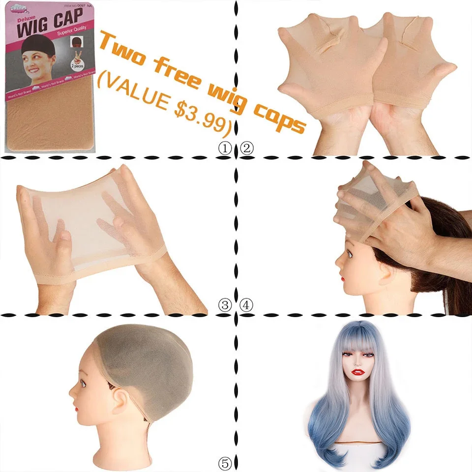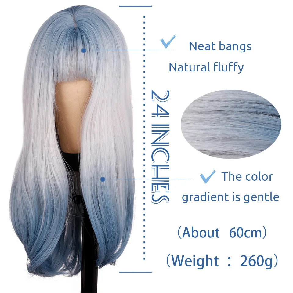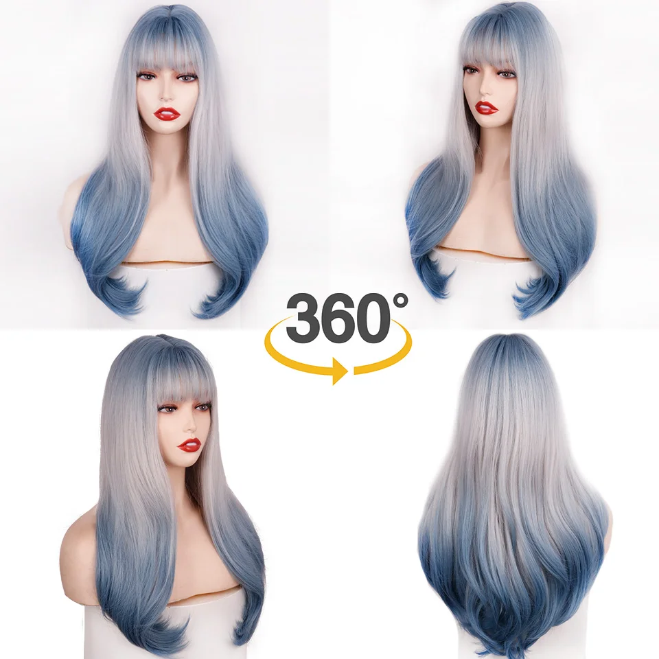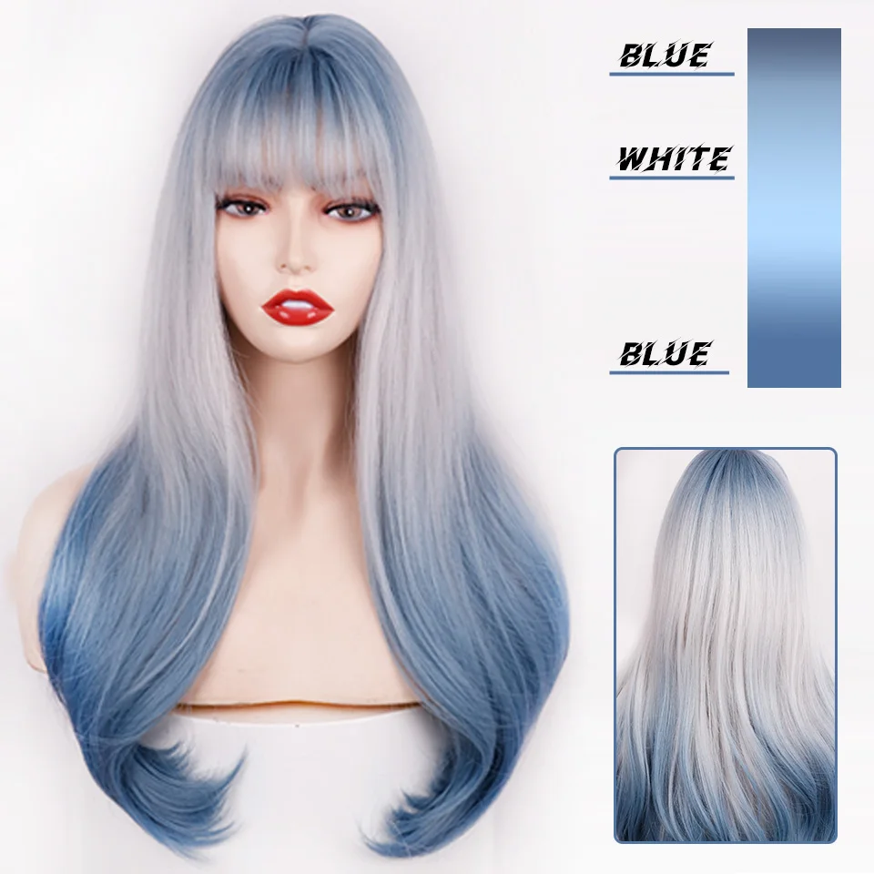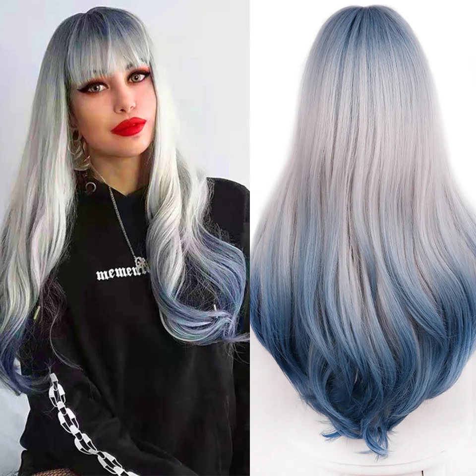 Синтетические длинные волосы с эффектом омбре, синие, белые, с челкой, натуральные волнистые волосы для женщин, для косплея, вечеринки, термостойкие волосы