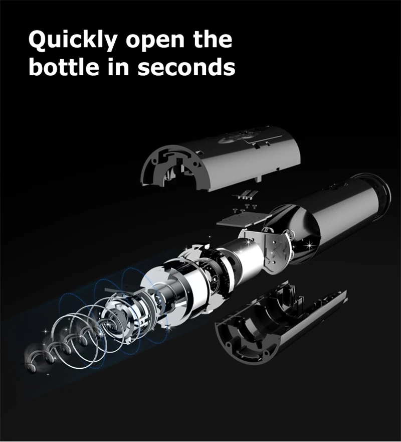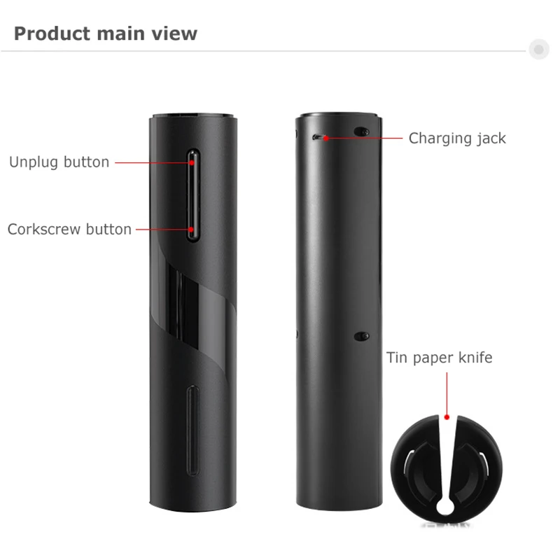 Простота в использовании: Простое управление кнопками, нажмите «кнопка вниз», чтобы удалить пробку из бутылки, нажмите «кнопка вверх», чтобы удалить пробку из штопора.