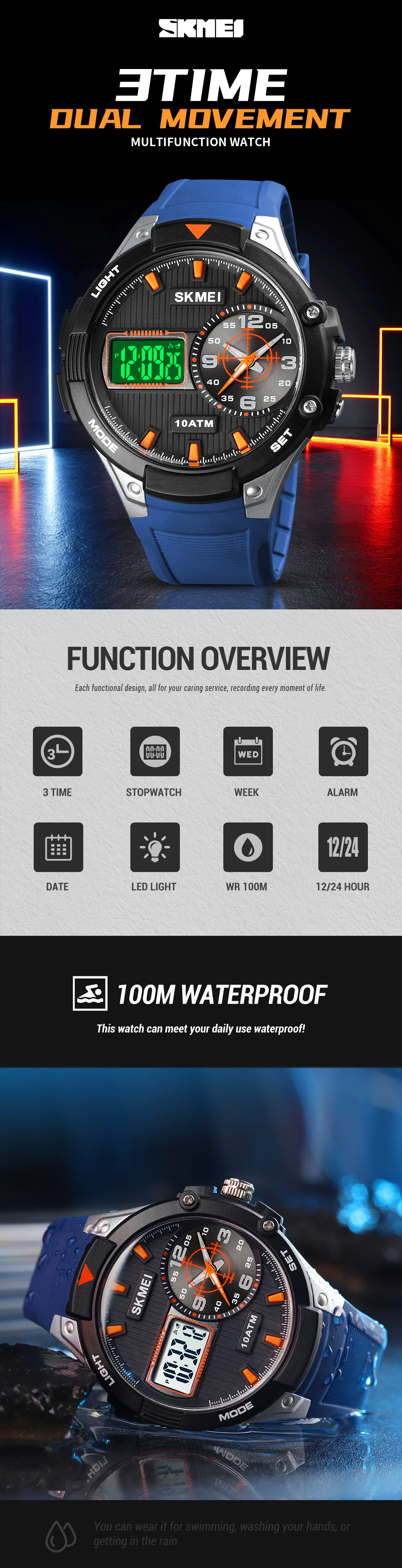 Skmei бренд электронные часы класса люкс 3 раз светодиодный светильник Для мужчин лидирующей марки 100 бар Водонепроницаемый часы оригинальные спортивные наручные часы