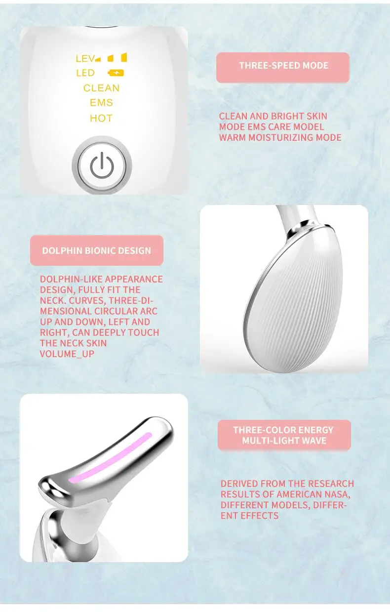 Когда головка устройства коснется кожи, продукт будет вибрировать. Массажная головка с чувствительностью температуры 45 ° и звуковым вибрационным массажем может способствовать циркуляции крови и замедлять старение эпидермальных клеток. Это уменьшит внешний вид линий шеи, уменьшит отечность, восстановит эластичность клеток.