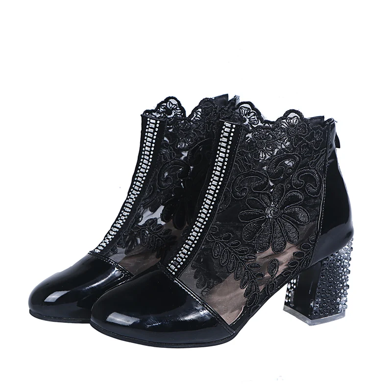Женские сетчатые ботильоны, черные ботинки на квадратном каблуке, с круглым носком, на шнуровке, O478, лето 2021