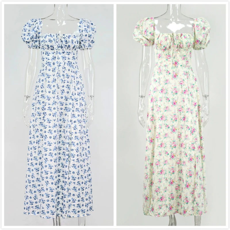Женское вечернее платье, с цветочным принтом, с буфами, коротким рукавом, с высоким разрезом, элегантное милое летнее платье на шнуровке
